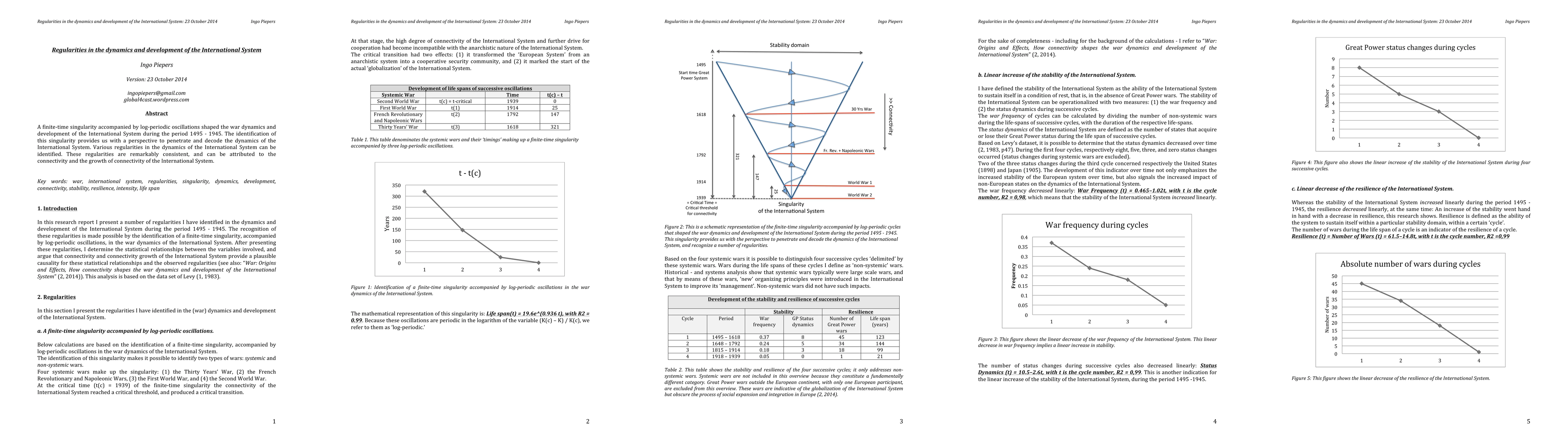 A finite-time singularity accompanied by log-periodic oscillations shaped the war dynamics and development of the International System during the period 1495 - 1945. The identification of this singularity provides us with a perspective to penetrate and decode the dynamics of the International System. Various regularities in the dynamics of the International System can be identified. These regularities are remarkably consistent, and can be attributed to the connectivity and the growth of connectivity of the International System.