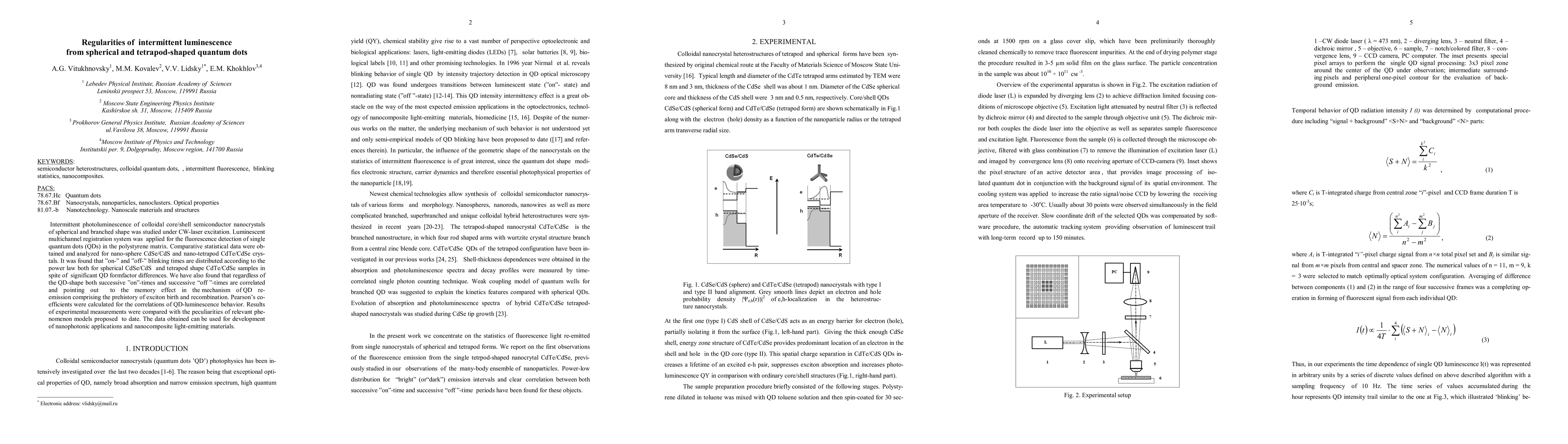 This paper investigates the intermittent luminescence of spherical and tetrapod-shaped quantum dots under continuous laser excitation, revealing that both types exhibit "on-" and "off-" blinking times following a power law distribution. The study highlights a memory effect in the luminescence mechanism, evidenced by correlated "on"- and "off"-times, and suggests potential applications in nanophotonics and light-emitting materials.