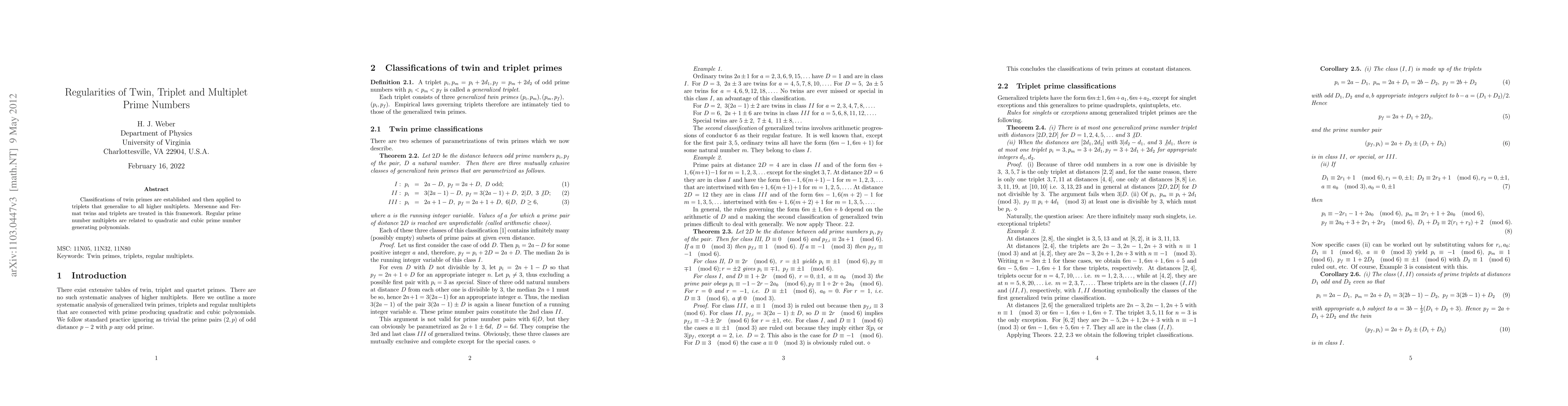 This paper classifies twin primes and extends the classification to triplets and higher multiplets, including Mersenne and Fermat primes. It also connects regular prime number multiplets to quadratic and cubic prime number generating polynomials.