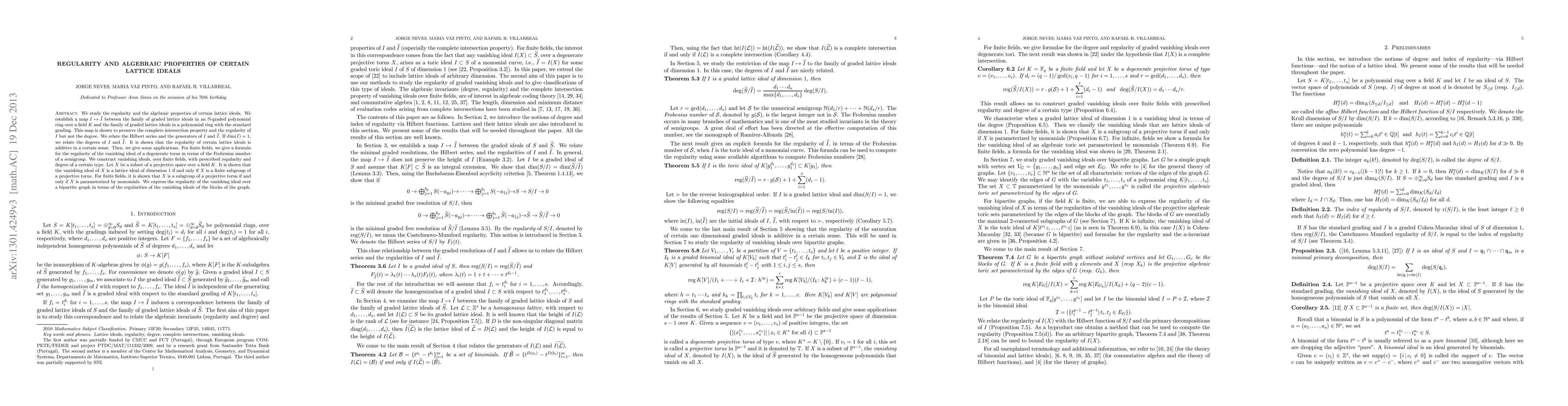 We study the regularity and the algebraic properties of certain lattice ideals. We establish a map I --> I\~ between the family of graded lattice ideals in an N-graded polynomial ring over a field K and the family of graded lattice ideals in a polynomial ring with the standard grading. This map is shown to preserve the complete intersection property and the regularity of I but not the degree. We relate the Hilbert series and the generators of I and I\~. If dim(I)=1, we relate the degrees of I and I\~. It is shown that the regularity of certain lattice ideals is additive in a certain sense. Then, we give some applications. For finite fields, we give a formula for the regularity of the vanishing ideal of a degenerate torus in terms of the Frobenius number of a semigroup. We construct vanishing ideals, over finite fields, with prescribed regularity and degree of a certain type. Let X be a subset of a projective space over a field K. It is shown that the vanishing ideal of X is a lattice ideal of dimension 1 if and only if X is a finite subgroup of a projective torus. For finite fields, it is shown that X is a subgroup of a projective torus if and only if X is parameterized by monomials. We express the regularity of the vanishing ideal over a bipartie graph in terms of the regularities of the vanishing ideals of the blocks of the graph.