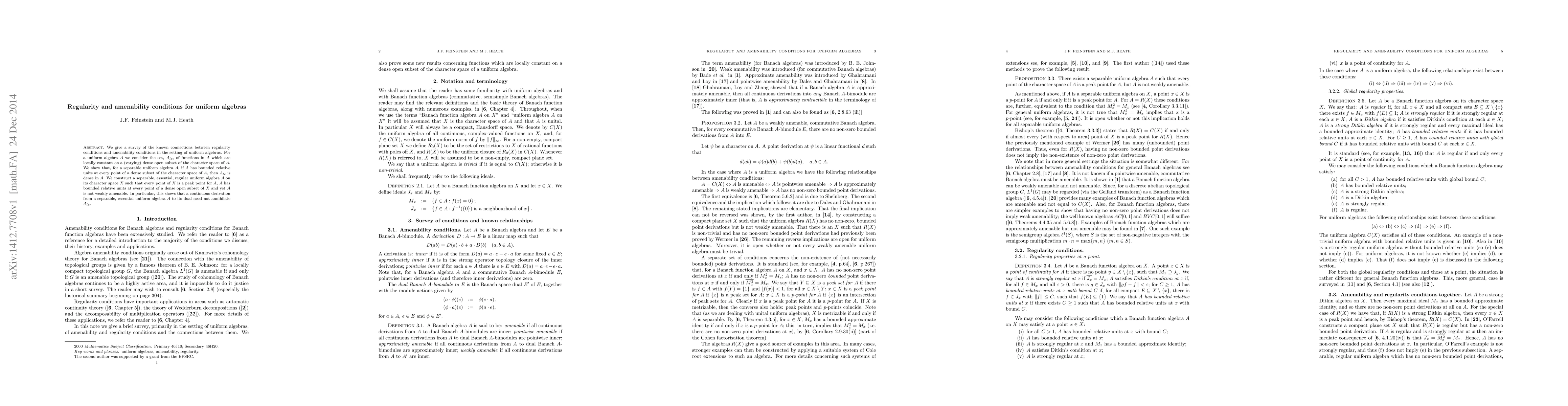Researchers studied the connection between regularity conditions and amenability in uniform algebras, finding that a separable algebra with bounded relative units at points of its character space has dense locally constant functions; they also constructed an essential, regular algebra that is not weakly amenable.