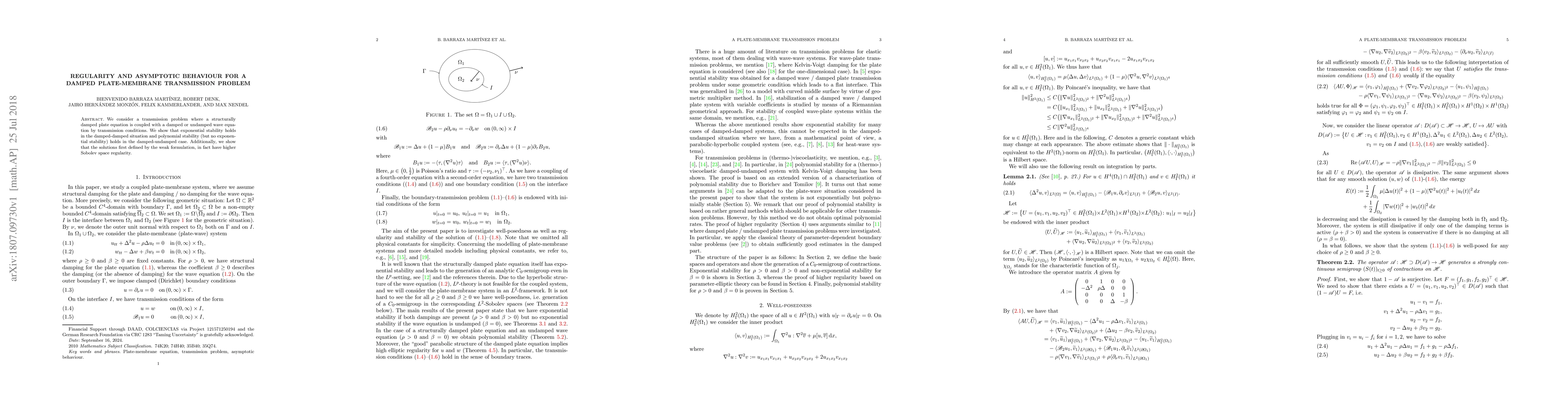 We consider a transmission problem where a structurally damped plate equation is coupled with a damped or undamped wave equation by transmission conditions. We show that exponential stability holds in the damped-damped situation and polynomial stability (but no exponential stability) holds in the damped-undamped case. Additionally, we show that the solutions first defined by the weak formulation, in fact have higher Sobolev space regularity.