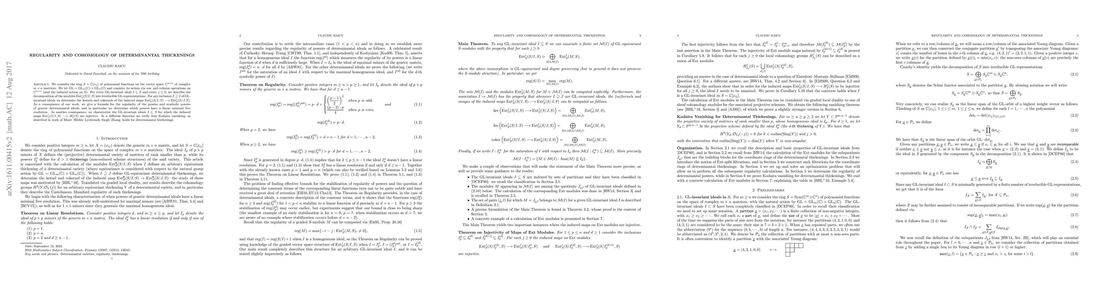 This paper studies the cohomology and regularity properties of determinantal thickenings within the ring of polynomial functions on complex matrices. It decomposes the Ext modules into irreducible GL-representations and determines the kernels and cokernels of induced maps, leading to formulas for the regularity of determinantal ideals and verification of Kodaira vanishing.