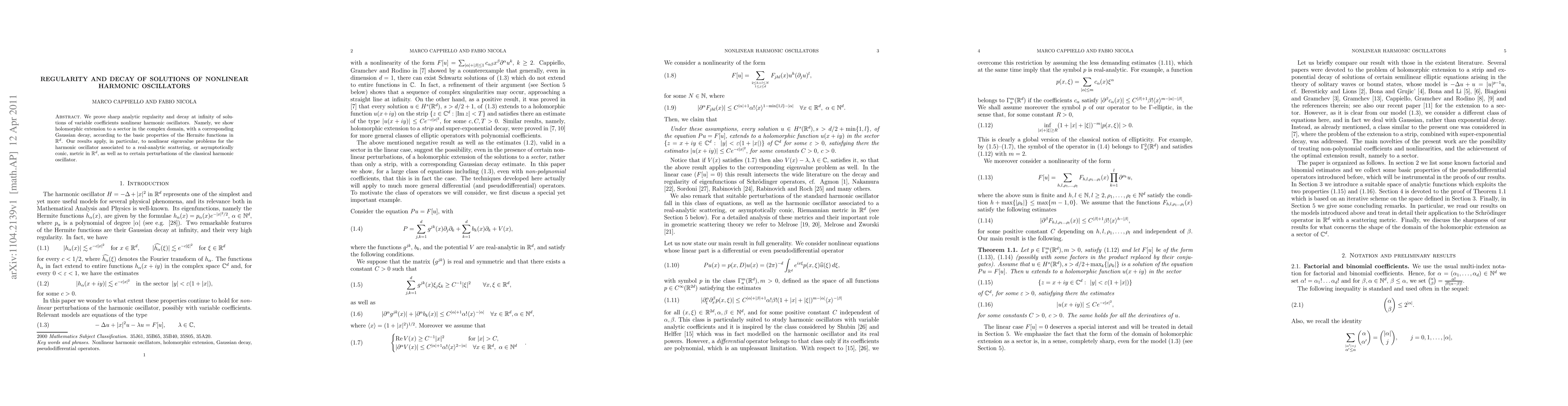 We prove sharp analytic regularity and decay at infinity of solutions of variable coefficients nonlinear harmonic oscillators. Namely, we show holomorphic extension to a sector in the complex domain, with a corresponding Gaussian decay, according to the basic properties of the Hermite functions in R^d. Our results apply, in particular, to nonlinear eigenvalue problems for the harmonic oscillator associated to a real-analytic scattering, or asymptotically conic, metric in R^d, as well as to certain perturbations of the classical harmonic oscillator.