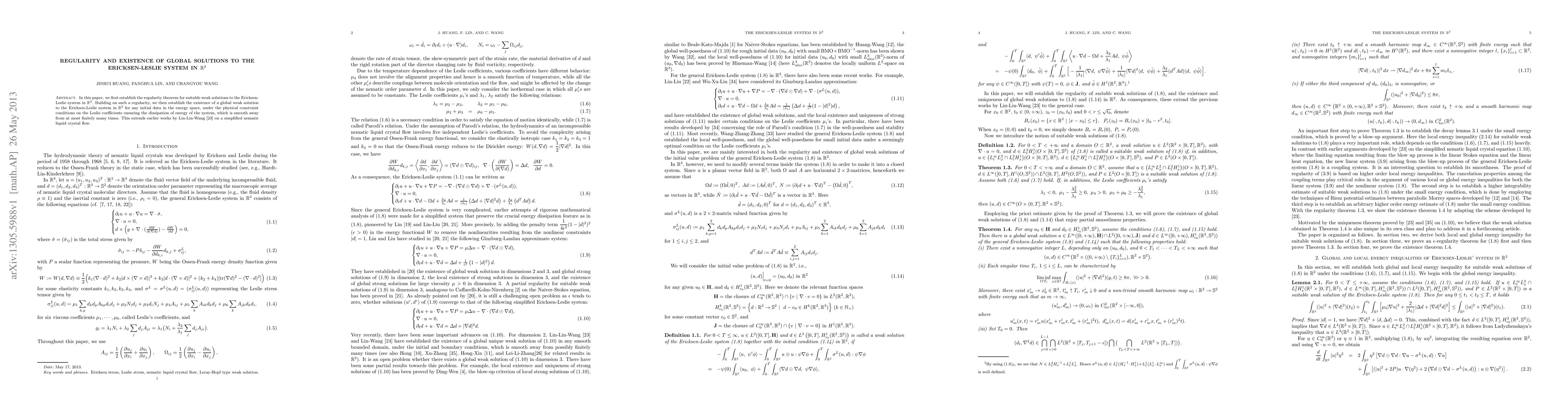 In this paper, we first establish the regularity theorem for suitable weak solutions to the Ericksen-Leslie system in dimensions two. Building on such a regularity, we then establish the existence of a global weak solution to the Ericksen-Leslie system in $\mathbb R^2$ for any initial data in the energy space, under the physical constraint conditions on the Leslie coefficients ensuring the dissipation of energy of the system, which is smooth away from at most finitely many times. This extends earlier works by Lin,Lin, and Wang on a simplified nematic liquid crystal flow in dimensions two.