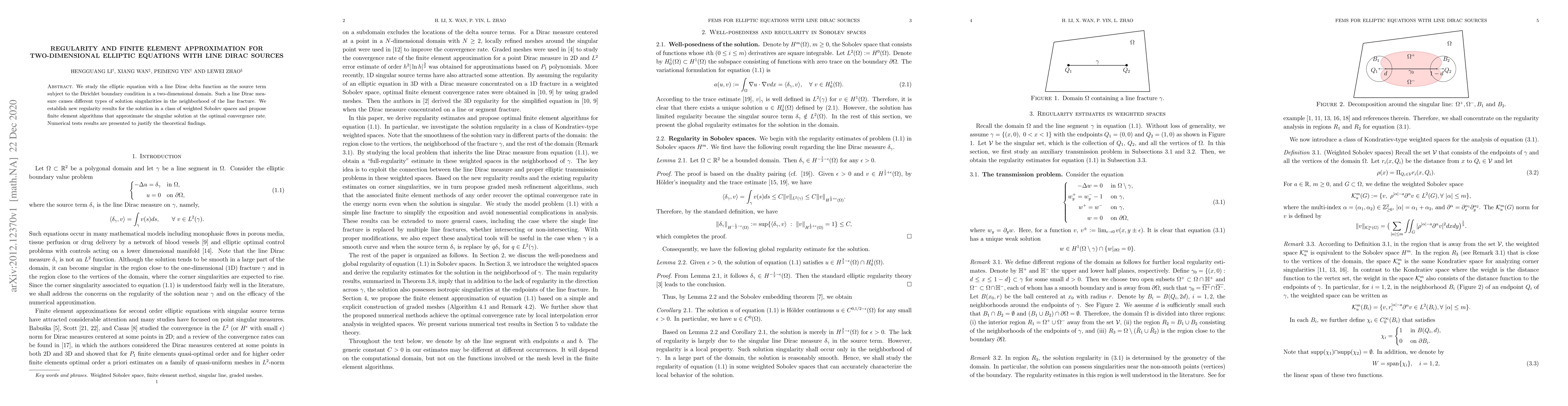 We study the elliptic equation with a line Dirac delta function as the source term subject to the Dirichlet boundary condition in a two-dimensional domain. Such a line Dirac measure causes different types of solution singularities in the neighborhood of the line fracture. We establish new regularity results for the solution in a class of weighted Sobolev spaces and propose finite element algorithms that approximate the singular solution at the optimal convergence rate. Numerical tests are presented to justify the theoretical findings.
