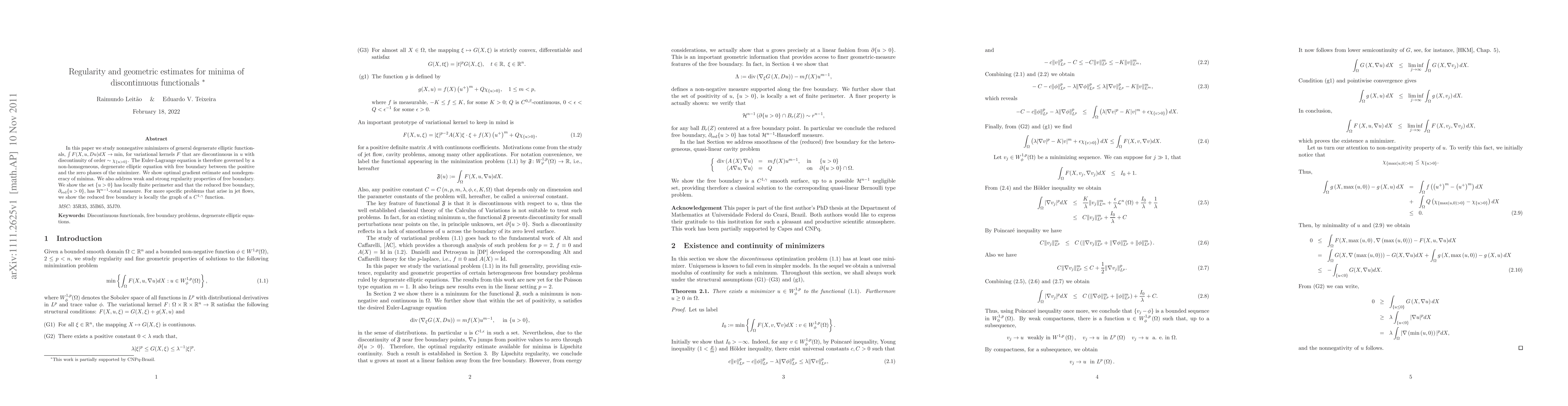 In this paper we study nonnegative minimizers of general degenerate elliptic functionals, $\int F(X,u,Du) dX \to \min$, for variational kernels $F$ that are discontinuous in $u$ with discontinuity of order $\sim \chi_{\{u > 0 \}}$. The Euler-Lagrange equation is therefore governed by a non-homogeneous, degenerate elliptic equation with free boundary between the positive and the zero phases of the minimizer. We show optimal gradient estimate and nondegeneracy of minima. We also address weak and strong regularity properties of free boundary. We show the set $\{u > 0 \}$ has locally finite perimeter and that the reduced free boundary, $\partial_\text{red} \{u > 0 \}$, has $\mathcal{H}^{n-1}$-total measure. For more specific problems that arise in jet flows, we show the reduced free boundary is locally the graph of a $C^{1,\gamma}$ function.