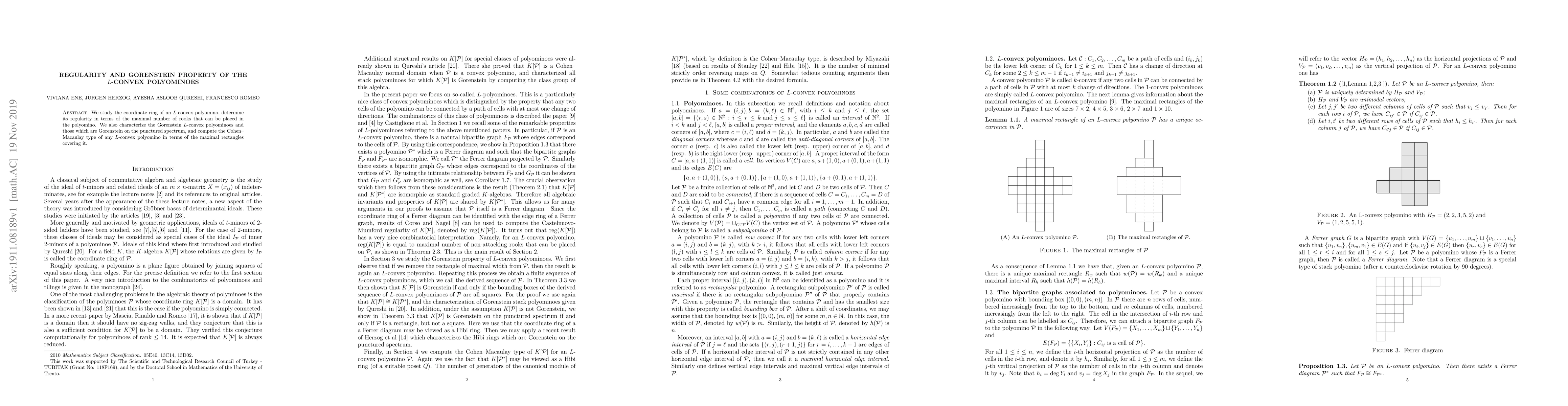 We study the coordinate ring of an $L$-convex polyomino, determine its regularity in terms of the maximal number of rooks that can be placed in the polyomino. We also characterize the Gorenstein $L$-convex polyominoes and those which are Gorenstein on the punctured spectrum, and compute the Cohen--Macaulay type of any $L$-convex polyomino in terms of the maximal rectangles covering it.