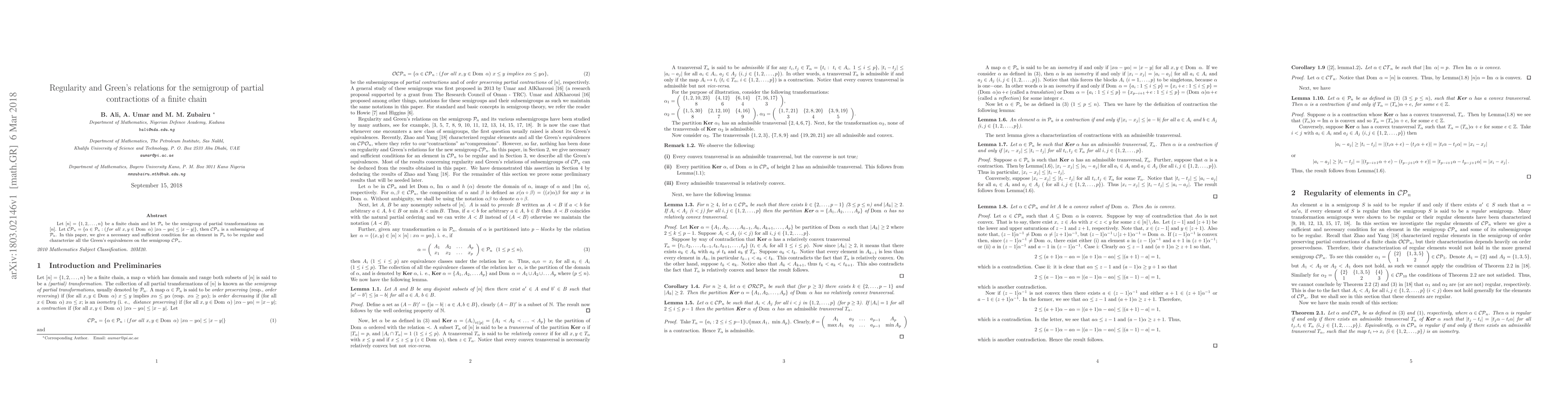 This paper investigates the semigroup $\mathcal{CP}_{n}$ of partial contractions on a finite chain $[n]$, providing a necessary and sufficient condition for regularity and characterizing all Green's equivalences within this semigroup.