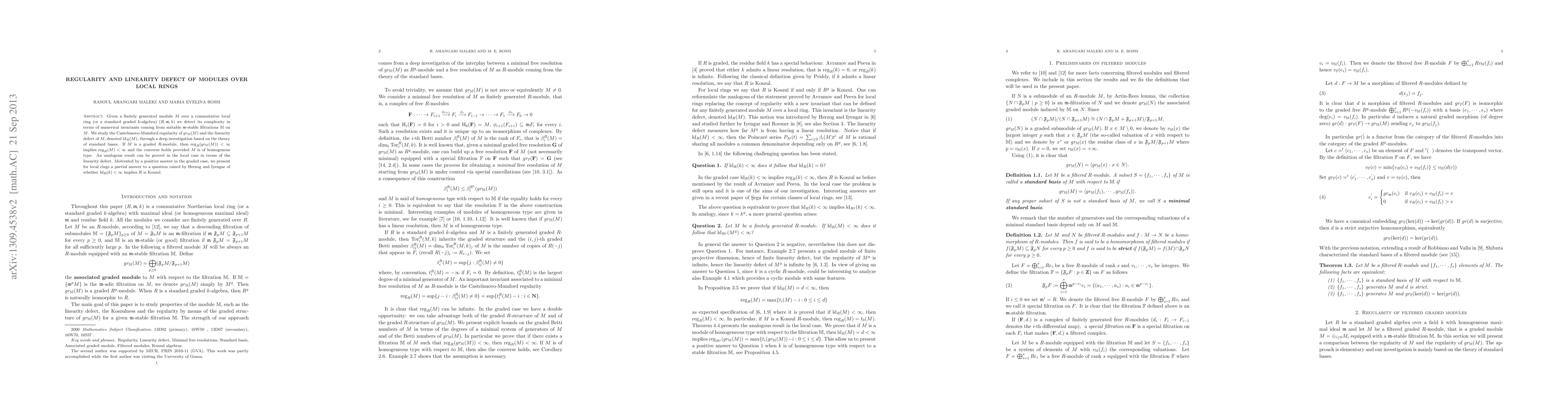 Given a finitely generated module $M$ over a commutative local ring (or a standard graded $k$-algebra) $(R,\m,k) $ we detect its complexity in terms of numerical invariants coming from suitable $\m$-stable filtrations $\mathbb{M}$ on $M$. We study the Castelnuovo-Mumford regularity of $gr_{\mathbb{M}}(M) $ and the linearity defect of $M,$ denoted $\ld_R(M),$ through a deep investigation based on the theory of standard bases. If $M$ is a graded $R$-module, then $\reg_R(gr_{\mathbb{M}}(M)) <\infty$ implies $\reg_R(M)<\infty$ and the converse holds provided $M$ is of homogenous type. An analogous result can be proved in the local case in terms of the linearity defect. Motivated by a positive answer in the graded case, we present for local rings a partial answer to a question raised by Herzog and Iyengar of whether $\ld_R(k)<\infty$ implies $R$ is Koszul.