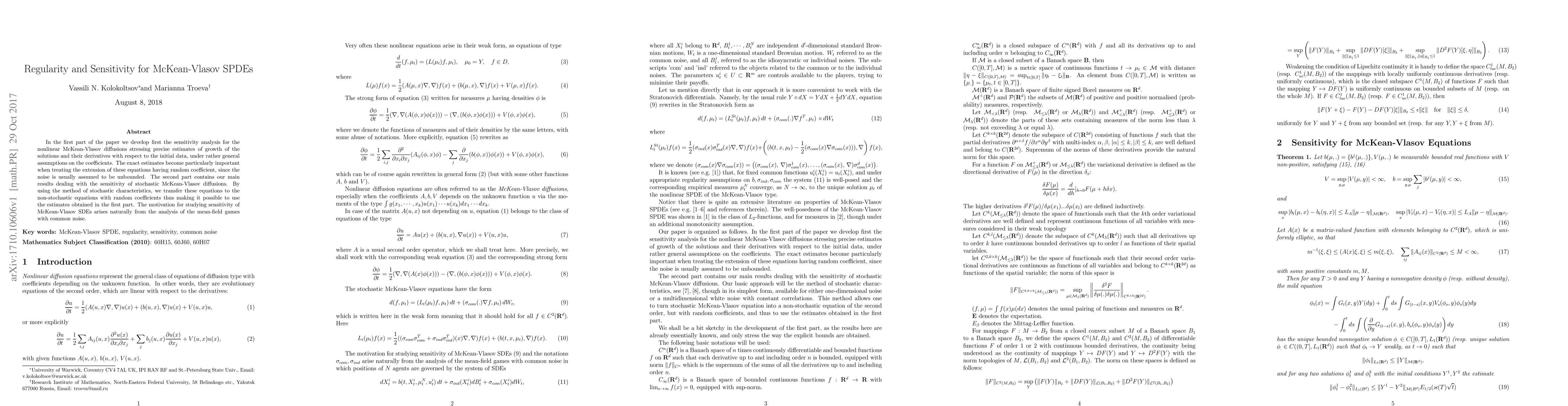 In the first part of the paper we develop the sensitivity analysis for the nonlinear McKean-Vlasov diffusions stressing precise estimates of growth of solutions and their derivatives with respect to the initial data, under rather general assumptions on the coefficients. The exact estimates become particularly important when treating the extension of these equations having random coefficient, since the noise is usually assumed to be unbounded. The second part contains our main results dealing with the sensitivity of stochastic McKean-Vlasov diffusions. By using the method of stochastic characteristics, we transfer these equations to the non-stochastic equations with random coefficients thus making it possible to use the estimates obtained in the first part. The motivation for studying sensitivity of McKean-Vlasov SPDEs arises naturally from the analysis of the mean-field games with common noise.