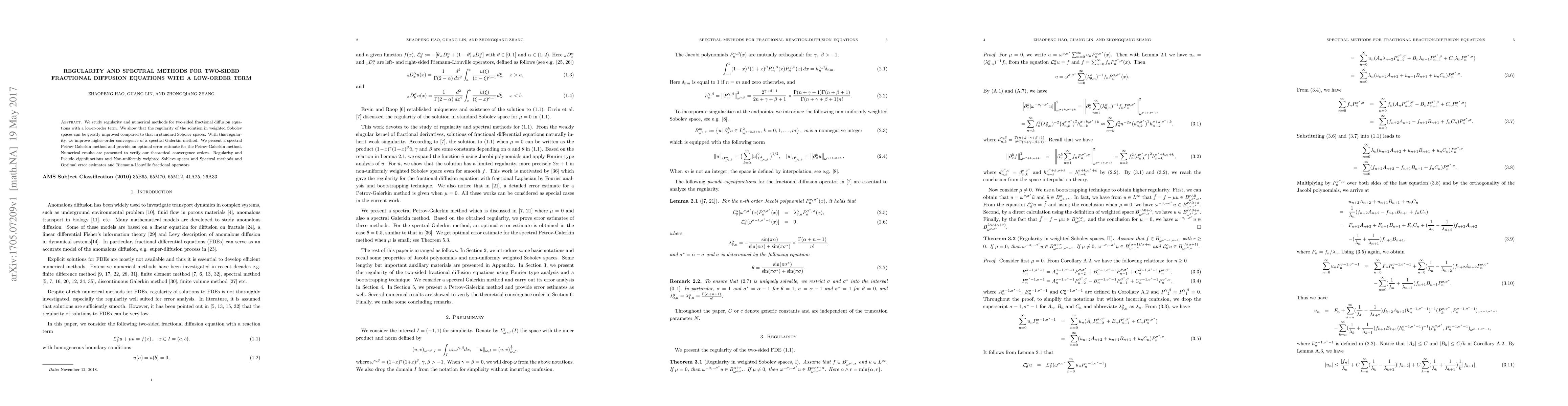 We study regularity and numerical methods for two-sided fractional diffusion equations with a lower-order term. We show that the regularity of the solution in weighted Sobolev spaces can be greatly improved compared to that in standard Sobolev spaces. With this regularity, we improve higher-order convergence of a spectral Galerkin method. We present a spectral Petrov-Galerkin method and provide an optimal error estimate for the Petrov-Galerkin method. Numerical results are presented to verify our theoretical convergence orders.