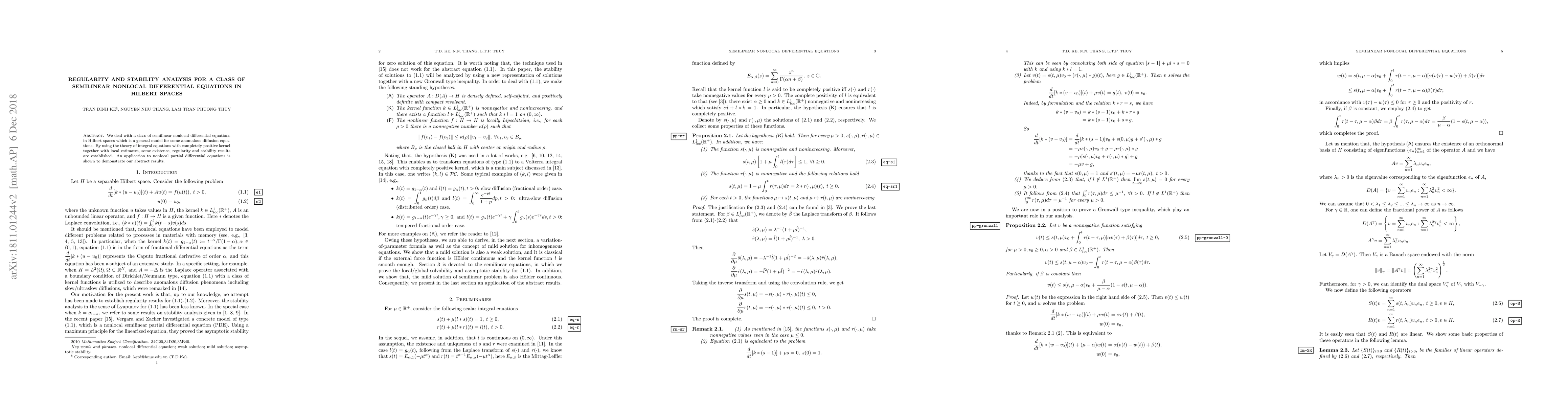 We deal with a class of semilinear nonlocal differential equations in Hilbert spaces which is a general model for some anomalous diffusion equations. By using the theory of integral equations with completely positive kernel together with local estimates, some existence, regularity and stability results are established. An application to nonlocal partial differential equations is shown to demonstrate our abstract results.