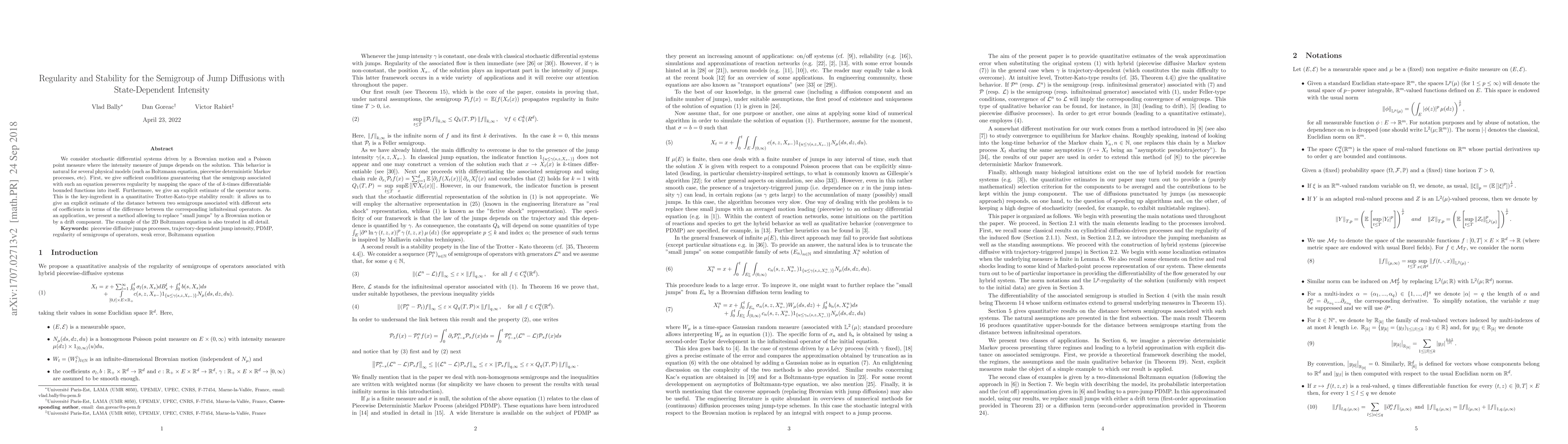 We consider stochastic differential systems driven by a Brownian motion and a Poisson point measure where the intensity measure of jumps depends on the solution. This behavior is natural for several physical models (such as Boltzmann equation, piecewise deterministic Markov processes, etc). First, we give sufficient conditions guaranteeing that the semigroup associated with such an equation preserves regularity by mapping the space of the of k-times differentiable bounded functions into itself. Furthermore, we give an explicit estimate of the operator norm. This is the key-ingredient in a quantitative Trotter-Kato-type stability result: it allows us to give an explicit estimate of the distance between two semigroups associated with different sets of coefficients in terms of the difference between the corresponding infinitesimal operators. As an application, we present a method allowing to replace " small jumps " by a Brownian motion or by a drift component. The example of the 2D Boltzmann equation is also treated in all detail.