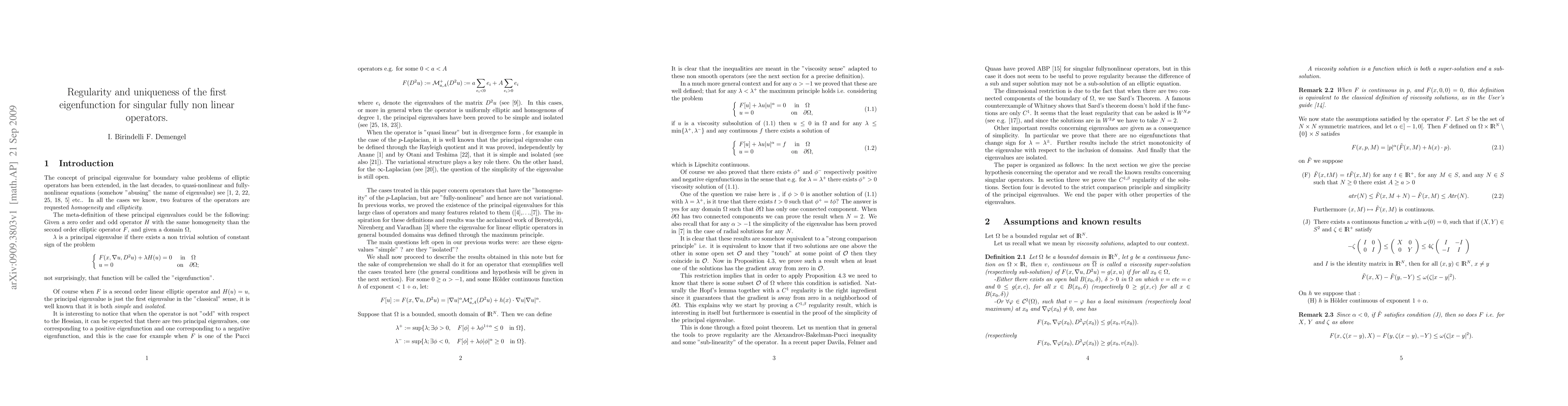 This paper demonstrates the $C^{1,\beta}$ regularity of solutions for singular fully nonlinear PDEs and proves the uniqueness of the first eigenfunction for the associated Dirichlet problem, leveraging regularity, a strict comparison principle, and Sard's theorem.