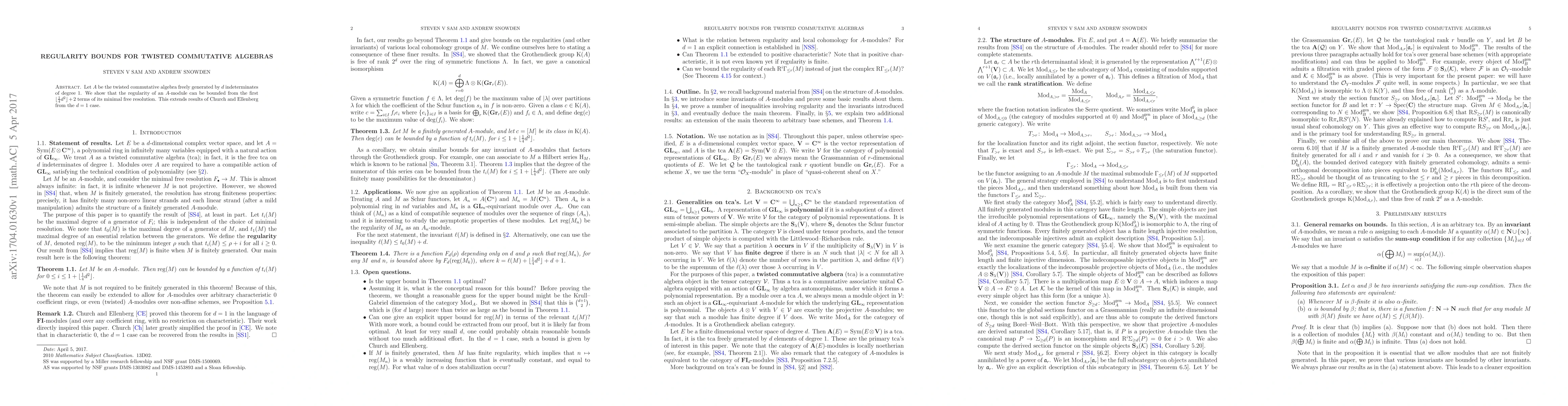Let A be the twisted commutative algebra freely generated by d indeterminates of degree 1. We show that the regularity of an A-module can be bounded from the first floor(d^2/4) + 2 terms of its minimal free resolution. This extends results of Church and Ellenberg from the d=1 case.