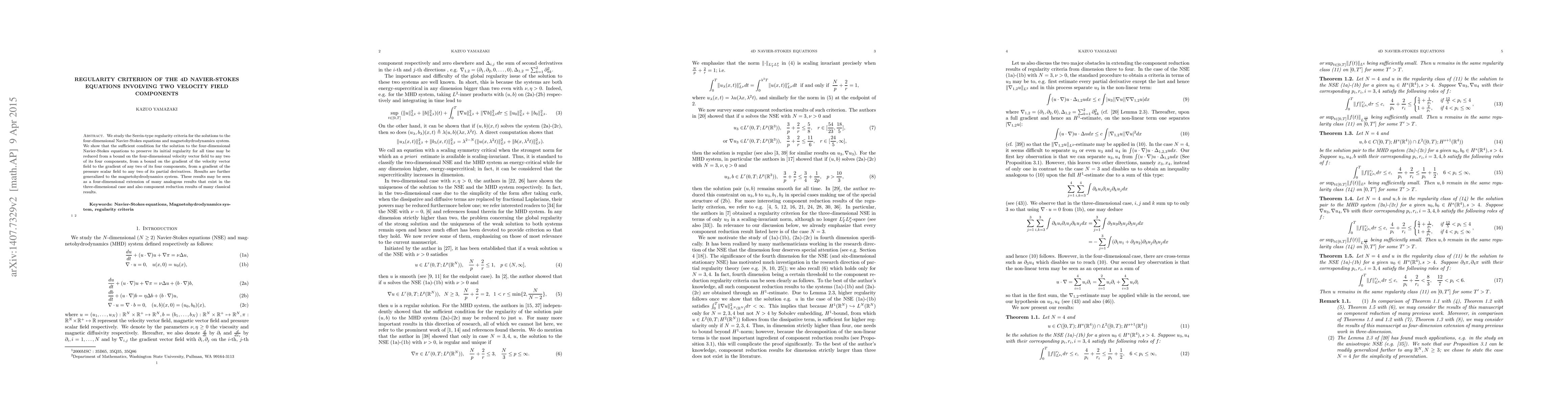 Researchers extend 3D Navier-Stokes regularity criteria to 4D equations, finding that preserving initial regularity depends on only two velocity components or their derivatives.