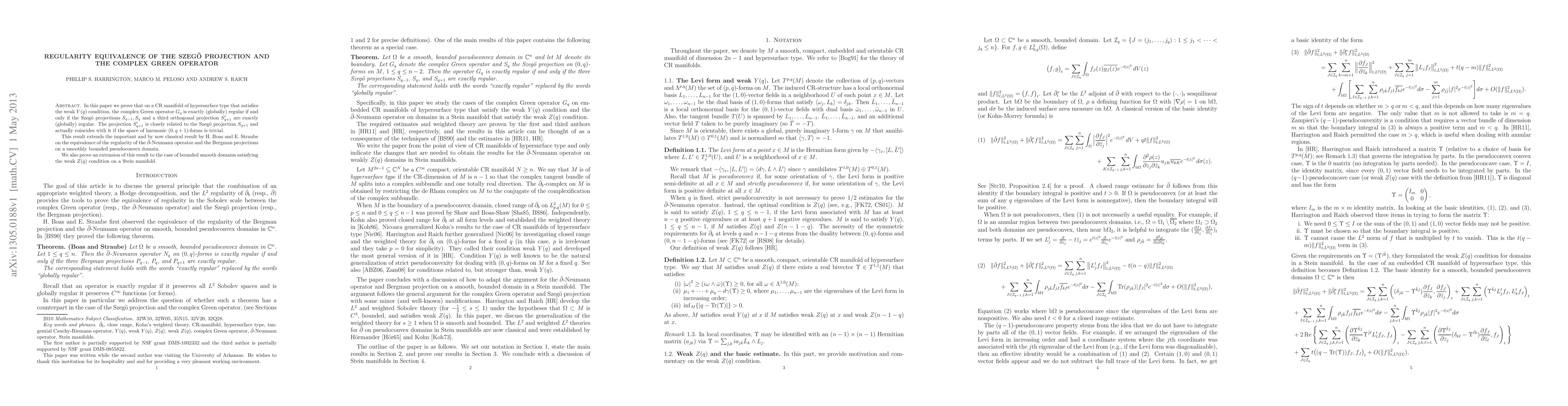 In this paper we prove that on a CR manifold of hypersurface type that satisfies the weak $Y(q)$ condition, the complex Green operator $G_q$ is exactly (globally) regular if and only if the Szeg\"o projections $S_{q-1}, S_q$ and a third orthogonal projection $S'_{q+1}$ are exactly (globally) regular. The projection $S'_{q+1}$ is closely related to the Szeg\"o projection $S_{q+1}$ and actually coincides with it if the space of harmonic $(0,q+1)$-forms is trivial. This result extends the important and by now classical result by H. Boas and E. Straube on the equivalence of the regularity of the $\bar\partial$-Neumann operator and the Bergman projections on a smoothly bounded pseudoconvex domain. We also prove an extension of this result to the case of bounded smooth domains satisfying the weak $Z(q)$ condition on a Stein manifold.