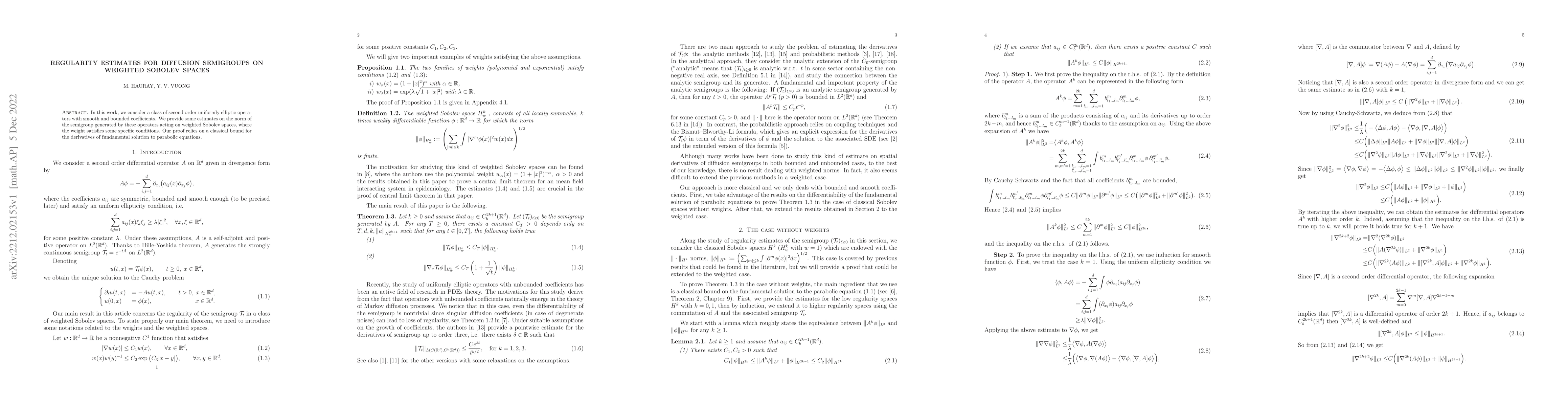 This paper establishes regularity estimates for the diffusion semigroup generated by uniformly elliptic operators on weighted Sobolev spaces, leveraging classical bounds for parabolic equations' fundamental solutions. The specific conditions on the weights are critical for the derived norm estimates.