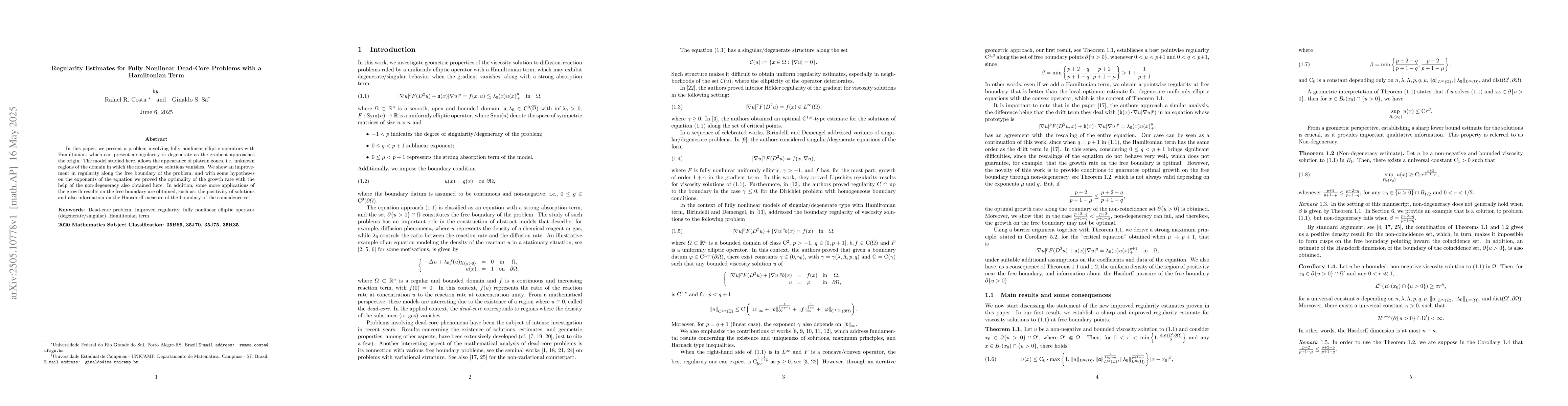 The paper presents novel regularity estimates for dead-core problems involving fully nonlinear elliptic operators with Hamiltonian terms, including optimal growth rate proofs and free boundary analysis.
