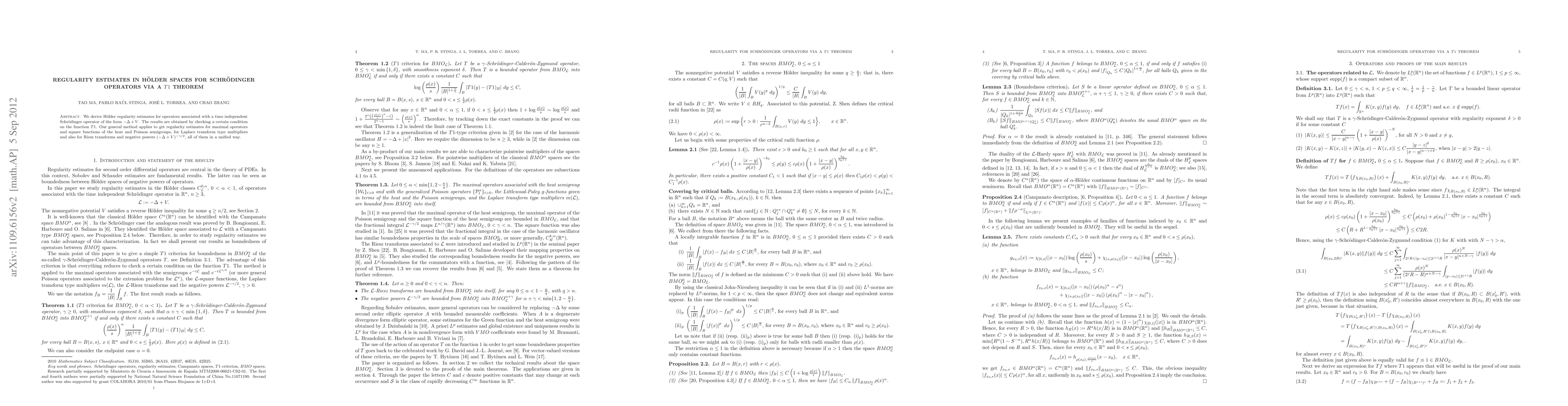 The paper derives Hölder regularity estimates for operators associated with a time-independent Schrödinger operator using a T1 theorem, applicable to maximal operators, square functions, and negative powers of the Schrödinger operator.