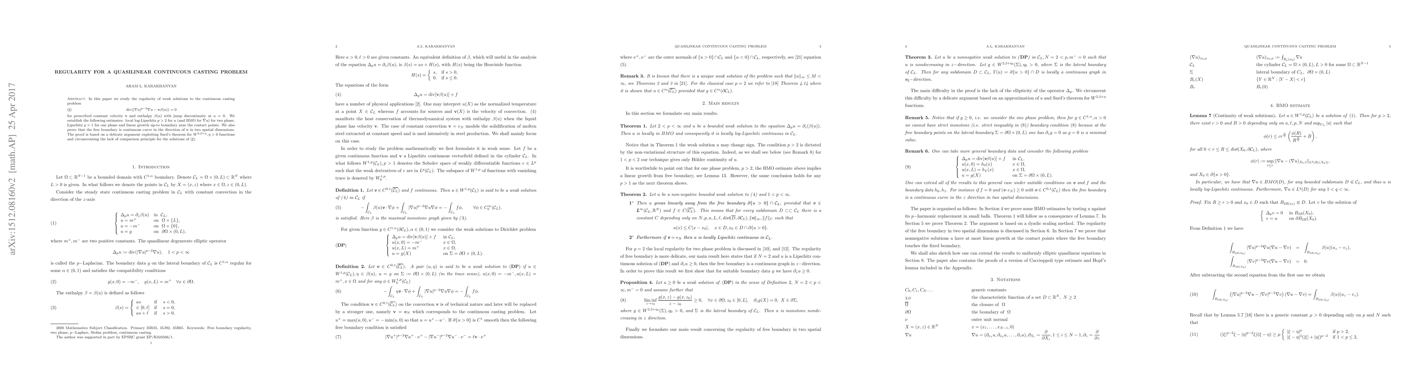In this paper study the regularity of continuous casting problem \begin{equation} \hbox{div}(|\nabla u|^{p-2}\nabla u-{\bf v} \beta(u))=0\tag{$\sharp$} \end{equation} for prescribed constant velocity $\bf v$ and enthalpy $\beta(u)$ with jump discontinuity at $u=0$. We establish the following estimates: local log-Lipschitz $p>2$ for $u$ (and BMO for $\nabla u$) for two phase, Lipschitz $p>1$ for one phase and linear growth up-to boundary near the contact points. We also prove that the free boundary is continuous curve in the direction of $\bf v$ in two spatial dimensions. The proof is based on a delicate argument exploiting Sard's theorem for $W^{2, 2+\eta}, \eta>0$ functions and circumventing the lack of comparison principle for the solutions of ($\sharp$).