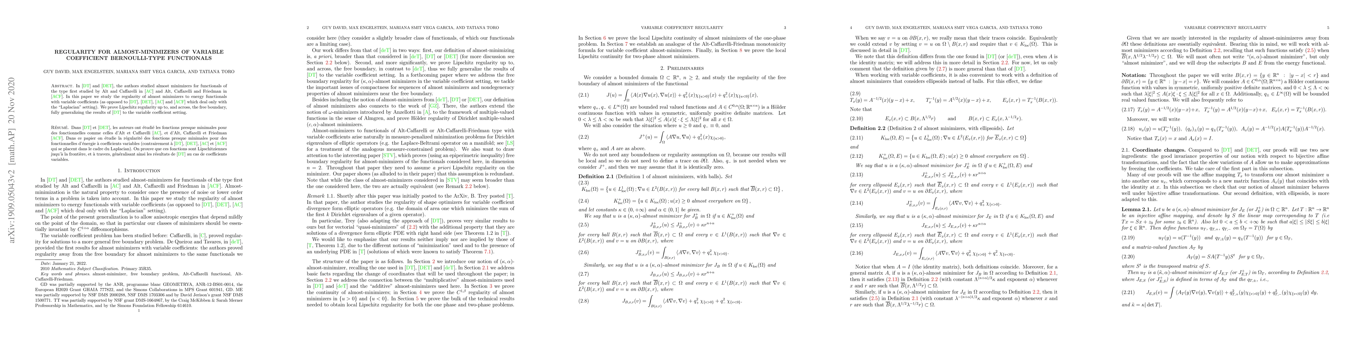 The paper introduces and proves key lemmas and theorems that establish Lipschitz regularity for almost-minimizers under variable coefficient settings, generalizing earlier results for the Laplacian case.