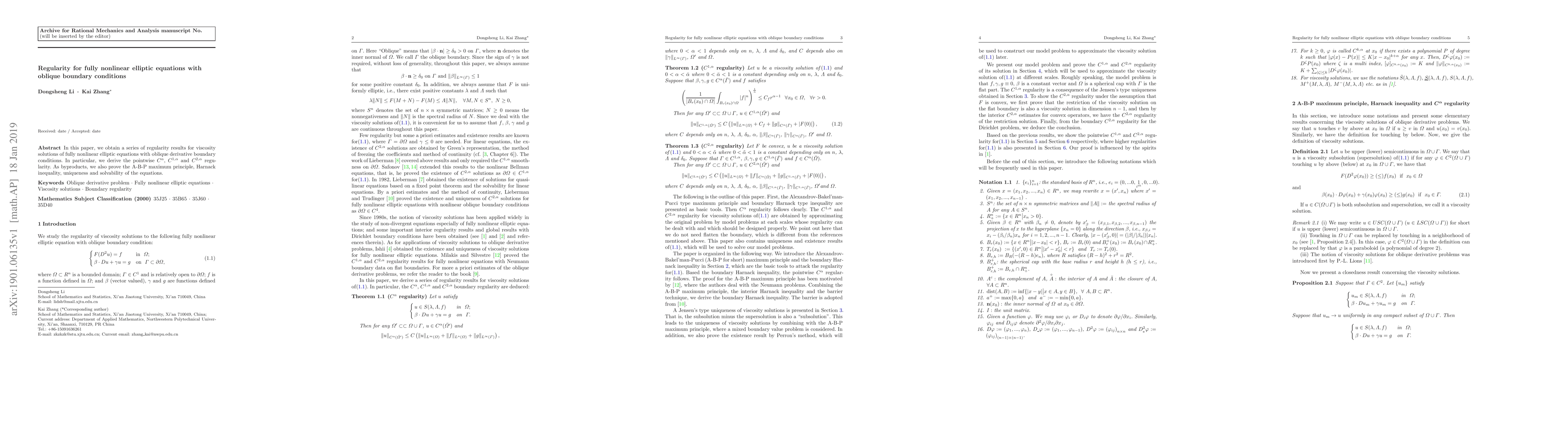 This paper presents regularity results for viscosity solutions of fully nonlinear elliptic equations with oblique boundary conditions, establishing pointwise $C^{\alpha}$, $C^{1,\alpha}$, and $C^{2,\alpha}$ regularity, alongside the A-B-P maximum principle, Harnack inequality, and proving uniqueness and solvability.
