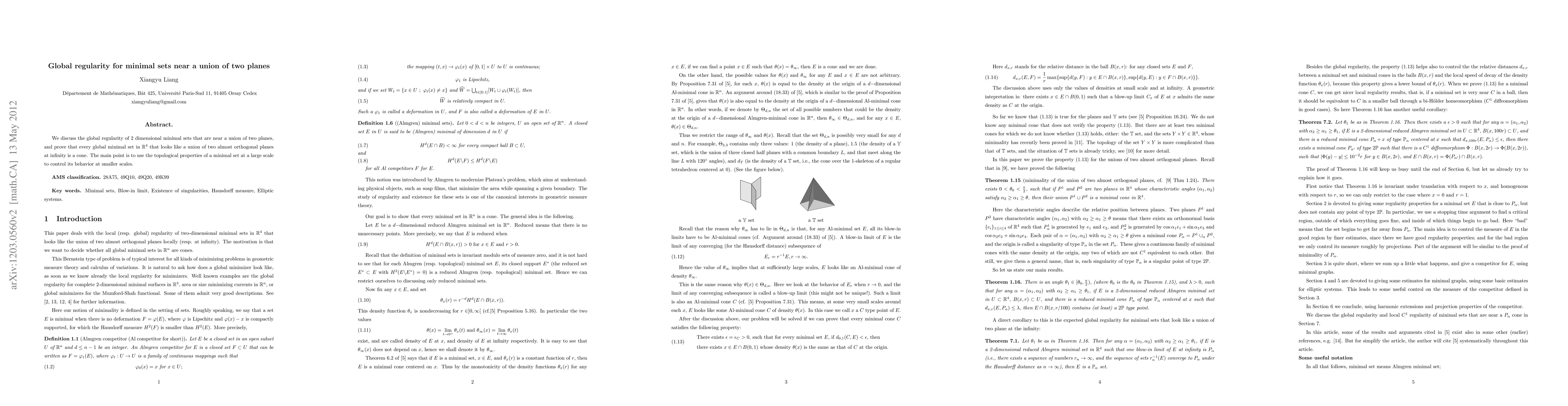 We discuss the global regularity of 2 dimensional minimal sets that are near a union of two planes, and prove that every global minimal set in R^4 that looks like a union of two almost orthogonal planes at infinity is a cone. The main point is to use the topological properties of a minimal set at a large scale to control its behavior at smaller scales.