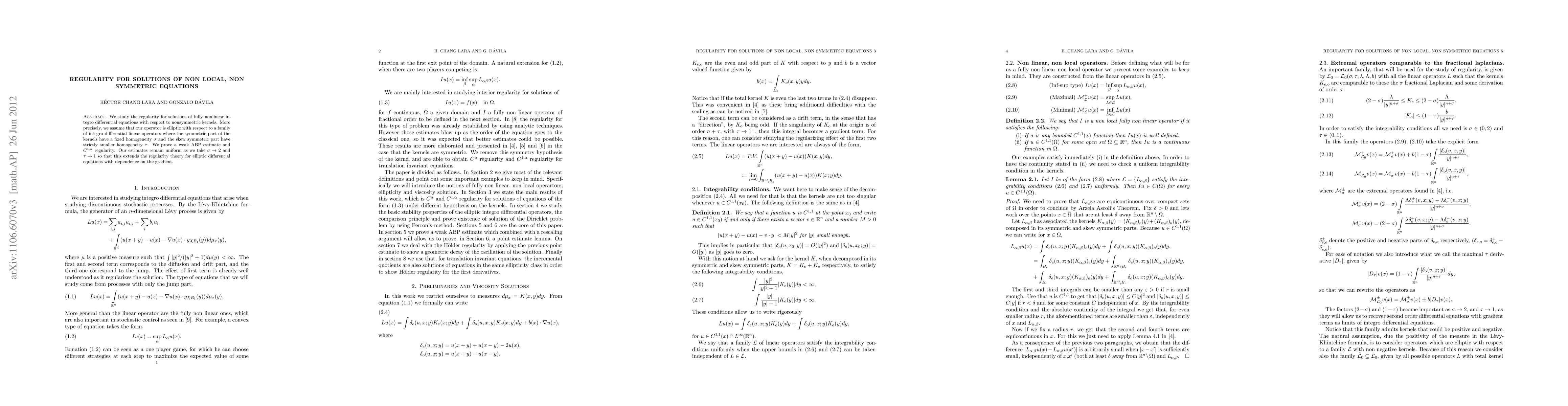 We study the regularity for solutions of fully nonlinear integro differential equations with respect to nonsymmetric kernels. More precisely, we assume that our operator is elliptic with respect to a family of integro differential linear operators where the symmetric part of the kernels have a fixed homogeneity $\sigma$ and the skew symmetric part have strictly smaller homogeneity $\tau$. We prove a weak ABP estimate and $C^{1,\alpha}$ regularity. Our estimates remain uniform as we take $\sigma \to 2$ and $\tau \to 1$ so that this extends the regularity theory for elliptic differential equations with dependence on the gradient.