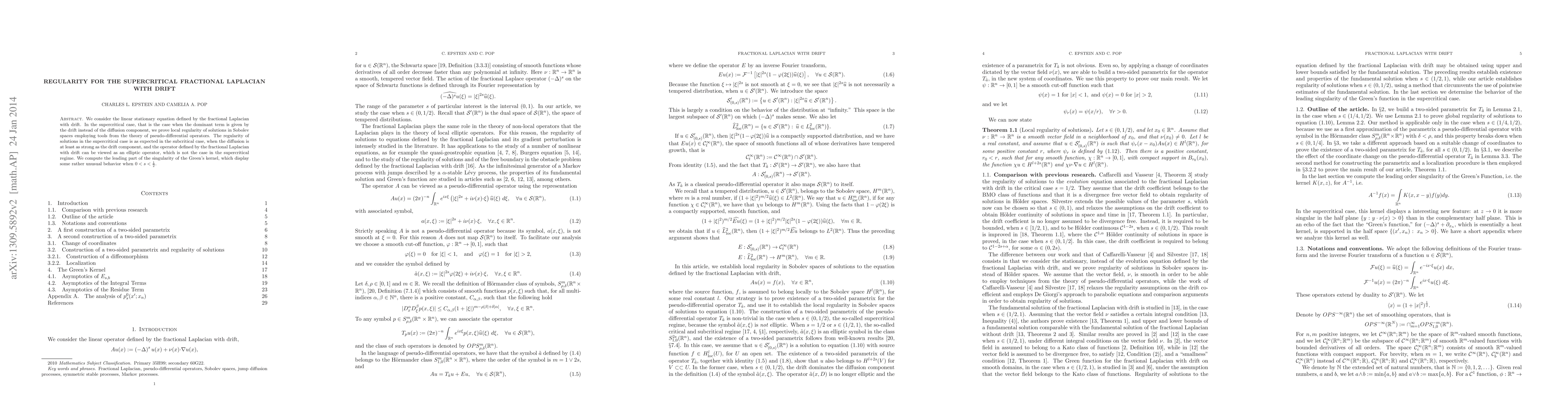 This paper proves local regularity of solutions in Sobolev spaces for the supercritical fractional Laplacian with drift, demonstrating that the regularity matches that of the subcritical case despite the drift being dominant. It also computes the leading singularity of the Green's kernel, revealing unusual behavior with greater singularity in the direction of the drift vector.