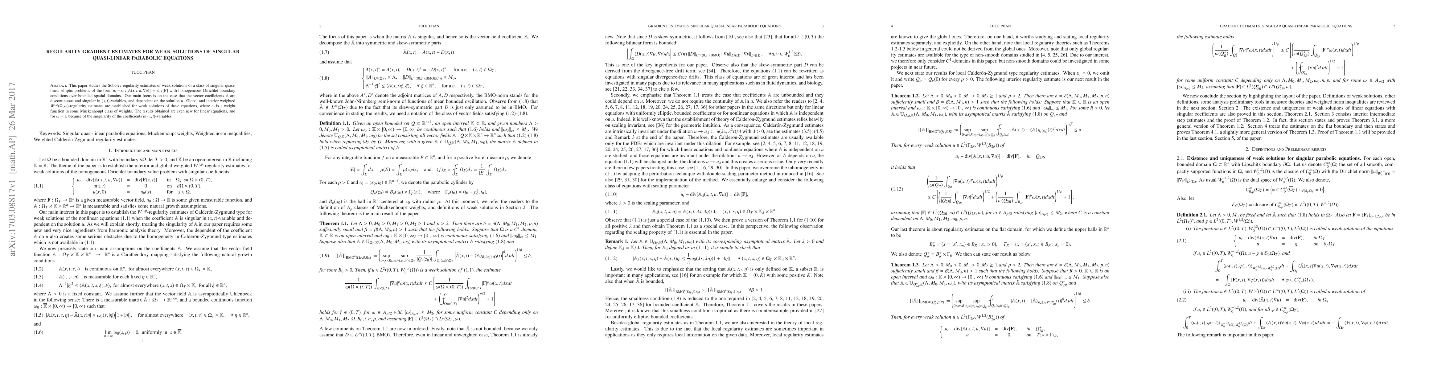 This paper studies the Sobolev regularity estimates of weak solutions of a class of singular quasi-linear elliptic problems of the form $u_t - \mbox{div}[\mathbb{A}(x,t,u,\nabla u)]= \mbox{div}[{\mathbf F}]$ with homogeneous Dirichlet boundary conditions over bounded spatial domains. Our main focus is on the case that the vector coefficients $\mathbb{A}$ are discontinuous and singular in $(x,t)$-variables, and dependent on the solution $u$. Global and interior weighted $W^{1,p}(\Omega, \omega)$-regularity estimates are established for weak solutions of these equations, where $\omega$ is a weight function in some Muckenhoupt class of weights. The results obtained are even new for linear equations, and for $\omega =1$, because of the singularity of the coefficients in $(x,t)$-variables
