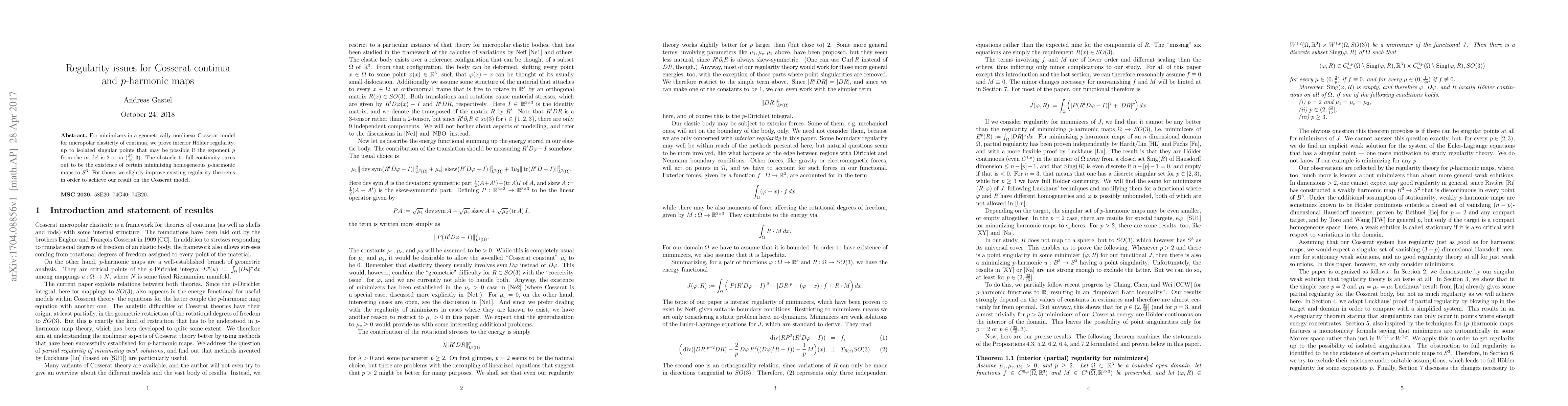For minimizers in a geometrically nonlinear Cosserat model for micropolar elasticity of continua, we prove interior H\"older regularity, up to isolated singular points that may be possible if the exponent $p$ from the model is $2$ or in $(\frac{32}{15},3)$. The obstacle to full continuity turns out to be the existence of certain minimizing homogeneous $p$-harmonic maps to $S^3$. For those, we slightly improve existing regularity theorems in order to achieve our result on the Cosserat model.