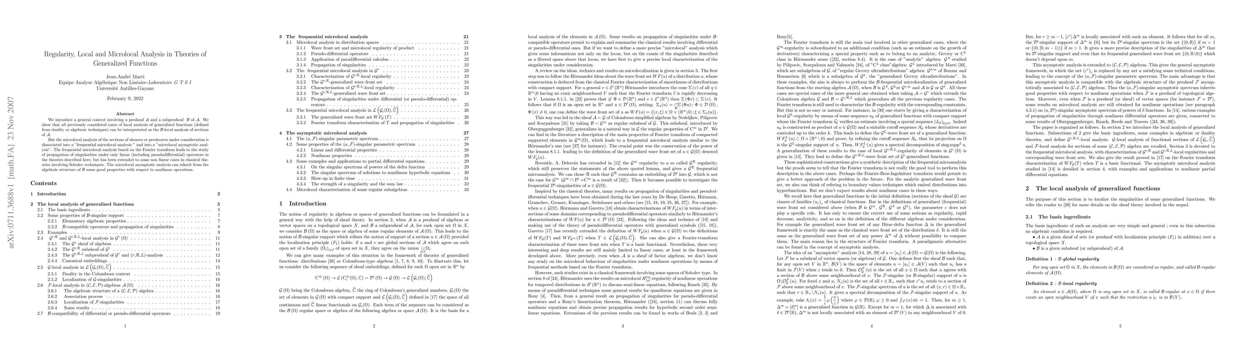 We introduce a general context involving a presheaf A and a subpresheaf B of A. We show that all previously considered cases of local analysis of generalized functions (defined from duality or algebraic techniques) can be interpretated as the B-local analysis of sections of A. But the microlocal analysis of the sections of sheaves or presheaves under consideration is dissociated into a "frequential microlocal analysis " and into a "microlocal asymptotic analysis". The frequential microlocal analysis based on the Fourier transform leads to the study of propagation of singularities under only linear (including pseudodifferential) operators in the theories described here, but has been extended to some non linear cases in classical theories involving Sobolev techniques. The microlocal asymptotic analysis can inherit from the algebraic structure of B some good properties with respect to nonlinear operations.