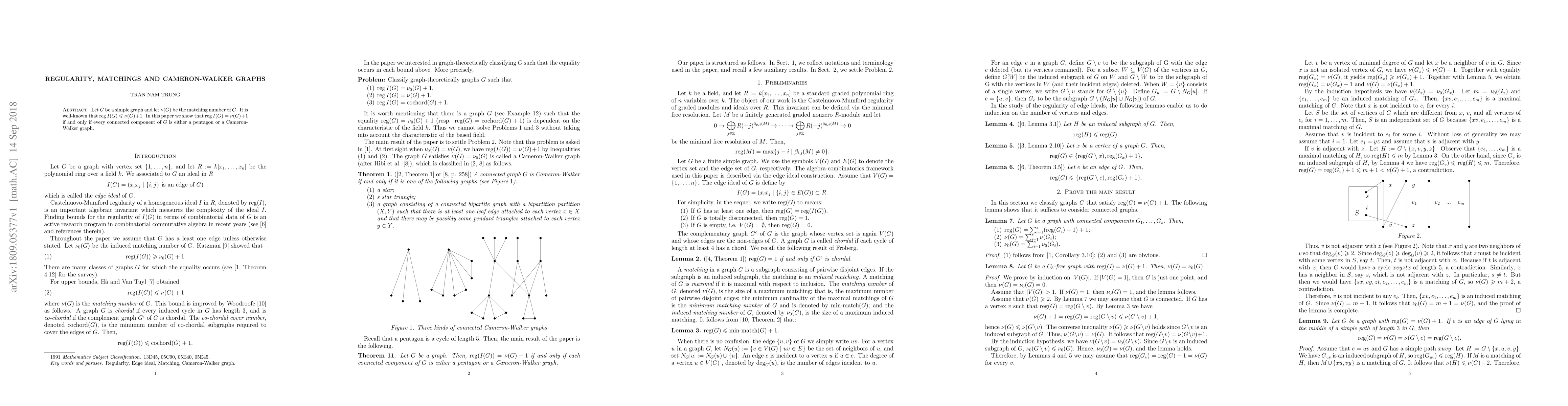 This paper explores the relationship between the regularity of the edge ideal of a graph $G$ and its matching number $\nu(G)$, proving that $\reg I(G) = \nu(G)+1$ if and only if each connected component of $G$ is either a pentagon or a Cameron-Walker graph.
