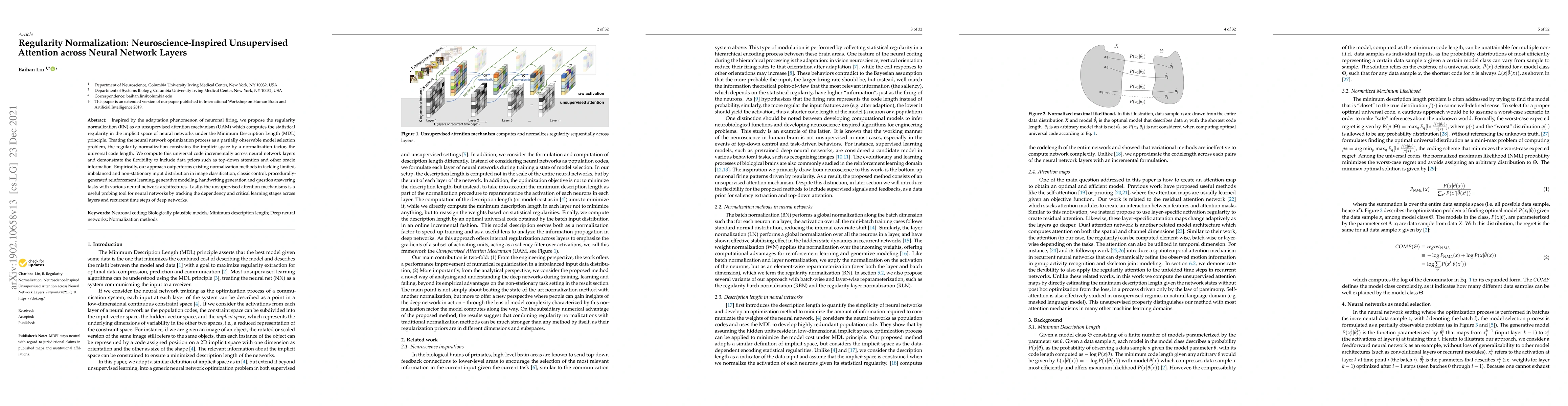 The paper proposes Regularity Normalization (RN), an unsupervised attention mechanism inspired by neuronal firing adaptation, which constrains the implicit space of neural networks using the Minimum Description Length (MDL) principle. RN computes statistical regularity across layers, incorporating data priors like top-down attention and oracle information.