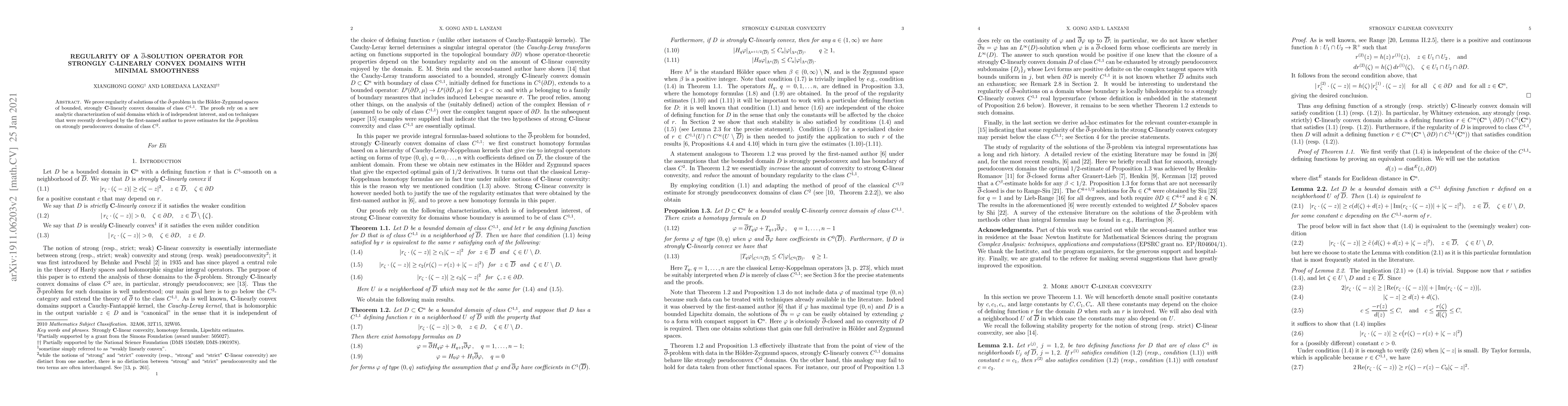 We prove regularity of solutions of the $\bar\partial$-problem in the H\"older-Zygmund spaces of bounded, strongly $\mathbf C$-linearly convex domains of class $C^{1,1}$. The proofs rely on a new, analytic characterization of said domains which is of independent interest, and on techniques that were recently developed by the first-named author to prove estimates for the $\bar\partial$-problem on strongly pseudoconvex domains of class $C^2$.