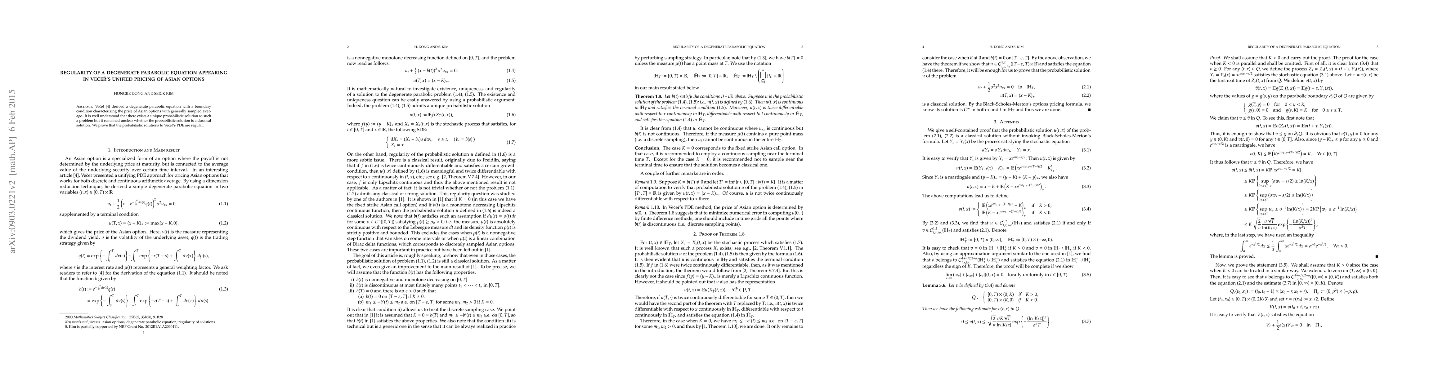 Vecer derived a degenerate parabolic equation with a boundary condition characterizing the price of Asian options with generally sampled average. It is well understood that there exists a unique probabilistic solution to such a problem but it remained unclear whether the probabilistic solution is a classical solution. We prove that the probabilistic solutions to Vecer's PDE are regular.