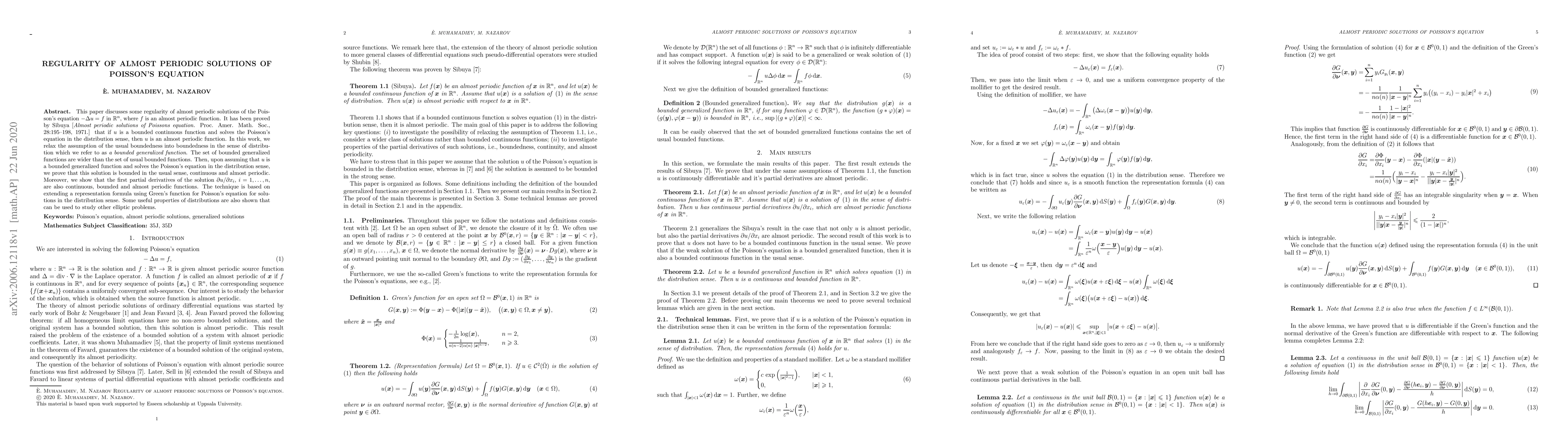 This paper investigates the regularity of almost periodic solutions to the Poisson's equation $-\Delta u = f$ with $f$ being an almost periodic function, proving that solutions under relaxed boundedness conditions are bounded, continuous, and almost periodic, with their first partial derivatives also sharing these properties. The technique employs Green's function and distribution theory.