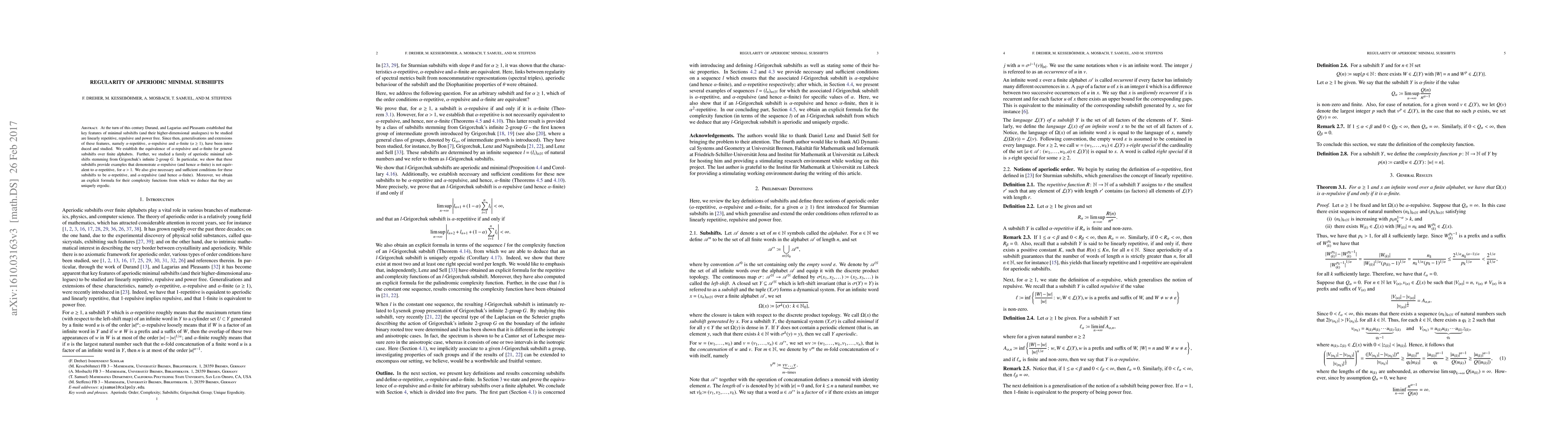 At the turn of this century Durand, and Lagarias and Pleasants established that key features of minimal subshifts (and their higher-dimensional analogues) to be studied are linearly repetitive, repulsive and power free. Since then, generalisations and extensions of these features, namely $\alpha$-repetitive, $\alpha$-repulsive and $\alpha$-finite ($\alpha \geq 1$), have been introduced and studied. We establish the equivalence of $\alpha$-repulsive and $\alpha$-finite for general subshifts over finite alphabets. Further, we studied a family of aperiodic minimal subshifts stemming from Grigorchuk's infinite $2$-group $G$. In particular, we show that these subshifts provide examples that demonstrate $\alpha$-repulsive (and hence $\alpha$-finite) is not equivalent to $\alpha$-repetitive, for $\alpha > 1$. We also give necessary and sufficient conditions for these subshifts to be $\alpha$-repetitive, and $\alpha$-repulsive (and hence $\alpha$-finite). Moreover, we obtain an explicit formula for their complexity functions from which we deduce that they are uniquely ergodic.