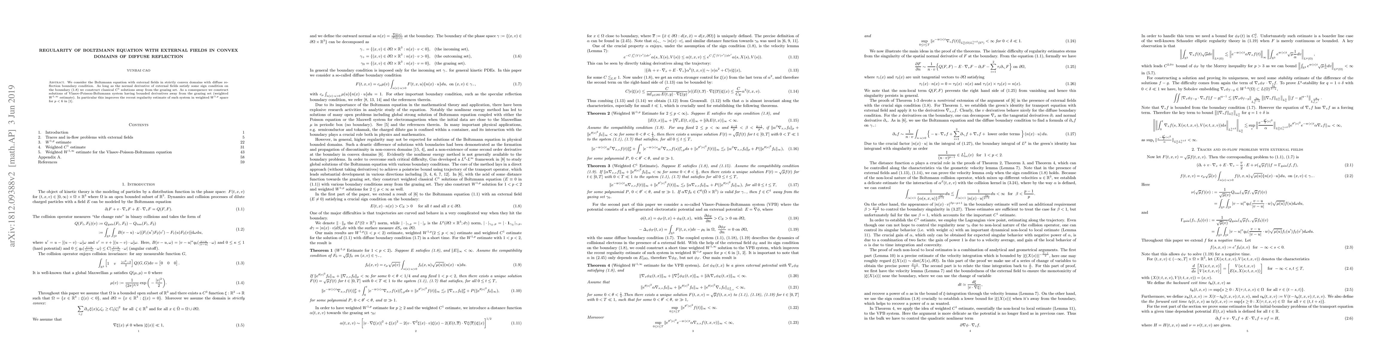 This paper constructs classical $C^1$ solutions for the Boltzmann equation with external fields in strictly convex domains under diffuse reflection boundary conditions, provided the normal derivative of external fields meets a specified sign condition. It also improves regularity estimates for the Vlasov-Poisson-Boltzmann system by achieving bounded derivatives away from the grazing set in weighted $W^{1,\infty}$ space.