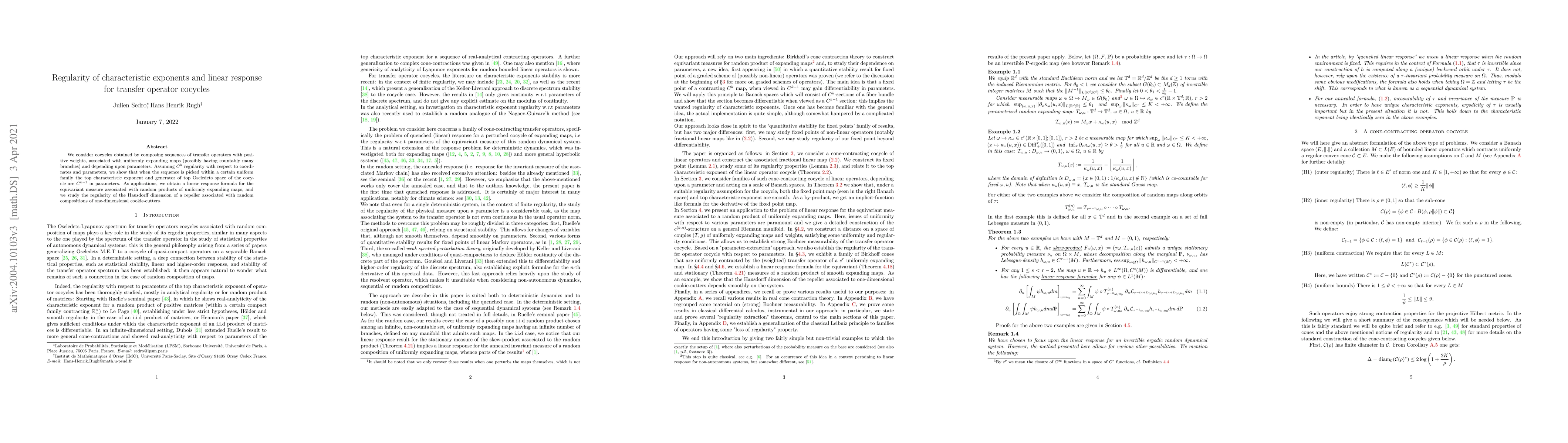 This paper demonstrates that the top characteristic exponent and generator of the top Oseledets space of cocycles formed by transfer operators with positive weights are $C^{k-1}$ smooth in parameters, given $C^k$ regularity. It also derives a linear response formula for equivariant measures and examines the regularity of Hausdorff dimension for random compositions of cookie-cutters.