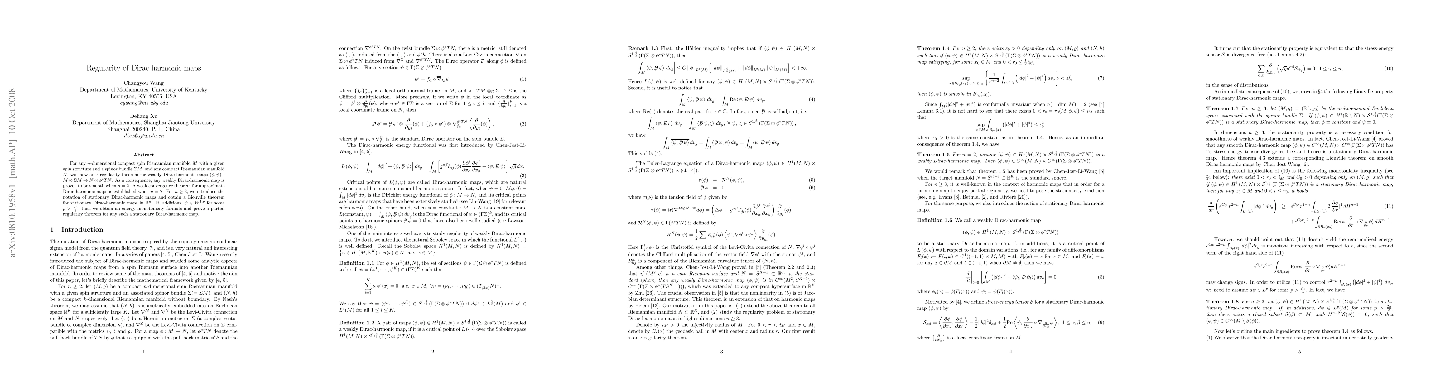 This paper establishes an $\epsilon$-regularity theorem for weakly Dirac-harmonic maps, proving they are smooth when the manifold dimension $n=2$. For higher dimensions, it introduces stationary Dirac-harmonic maps and proves a Liouville theorem, along with an energy monotonicity formula and partial regularity under certain conditions.