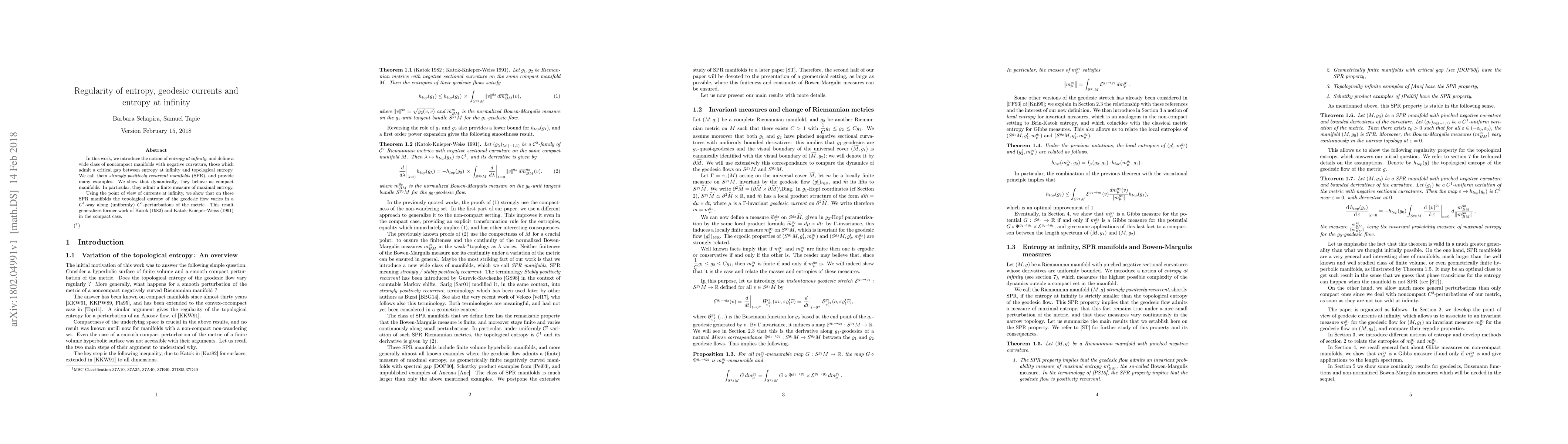 In this work, we introduce the notion of entropy at infinity, and define a wide class of noncompact manifolds with negative curvature, those which admit a critical gap between entropy at infinity and topological entropy. We call them strongly positively recurrent manifolds (SPR), and provide many examples. We show that dynamically, they behave as compact manifolds. In particular, they admit a finite measure of maximal entropy. Using the point of view of currents at infinity, we show that on these SPR manifolds the topological entropy of the geodesic flow varies in a C 1 -way along (uniformly) C 1 -perturbations of the metric. This result generalizes former work of Katok (1982) and Katok-Knieper-Weiss (1991) in the compact case.