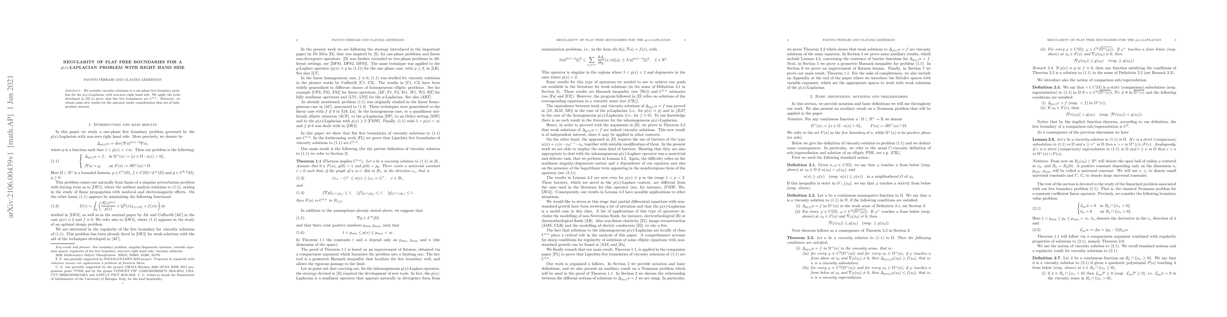 This paper studies viscosity solutions to a one-phase free boundary problem involving the $p(x)$-Laplacian with a non-zero right-hand side. It proves that flat free boundaries are $C^{1,\alpha}$ using tools developed in \cite{D}, and provides new insights into the $p(x)$-Laplacian operator.
