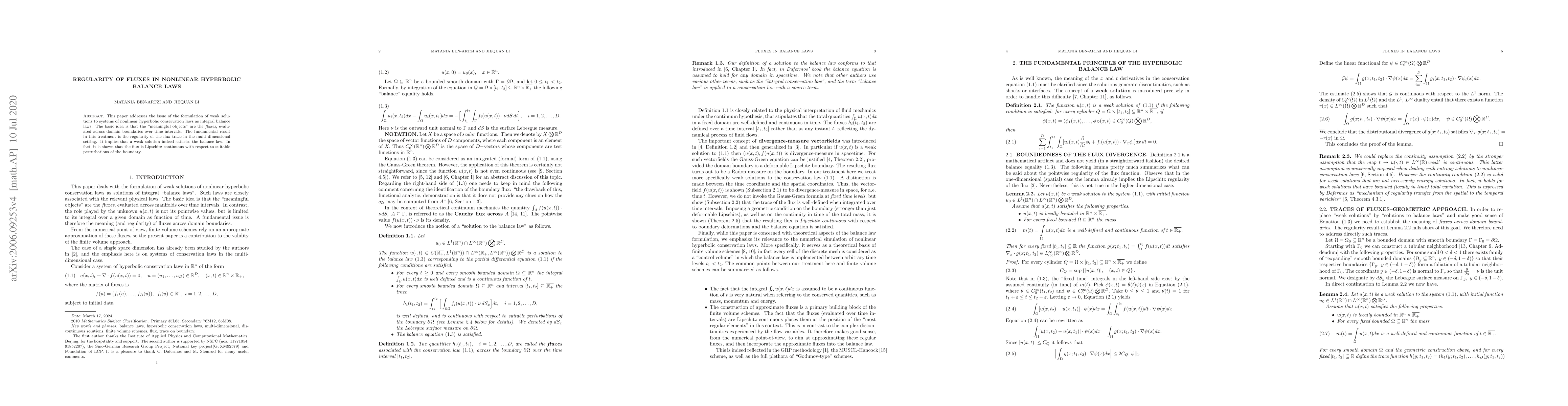This paper addresses the issue of the formulation of weak solutions to systems of nonlinear hyperbolic conservation laws as integral balance laws. The basic idea is that the "meaningful objects" are the fluxes, evaluated across domain boundaries over time intervals. The fundamental result in this treatment is the regularity of the flux trace in the multi-dimensional setting. It implies that a weak solution indeed satisfies the balance law. In fact, it is shown that the flux is Lipschitz continuous with respect to suitable perturbations of the boundary.