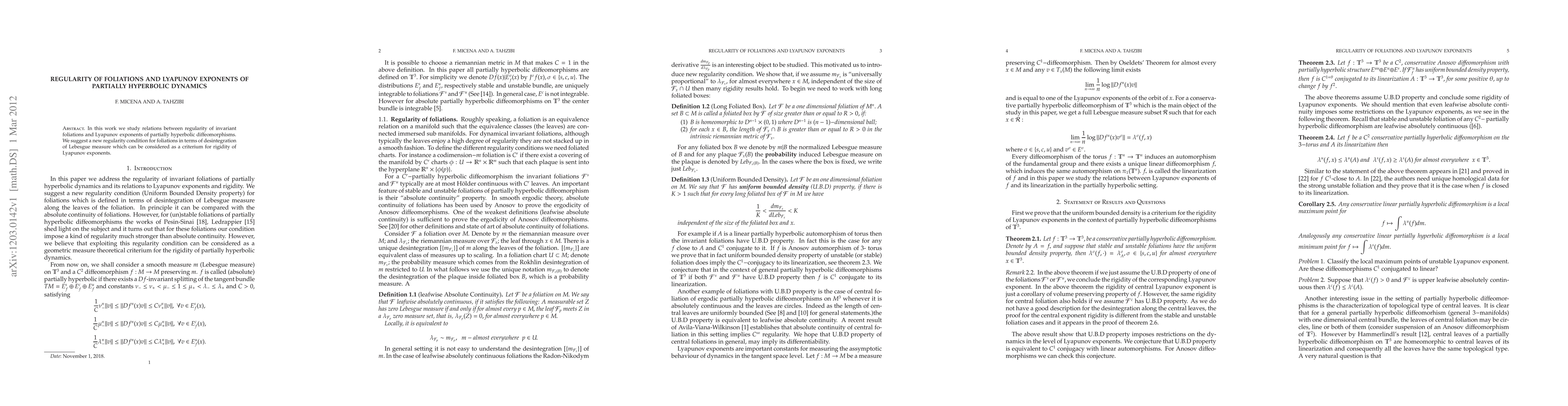In this work we study relations between regularity of invariant foliations and Lyapunov exponents of partially hyperbolic diffeomorphisms. We suggest a new regularity condition for foliations in terms of desintegration of Lebesgue measure which can be considered as a criterium for rigidity of Lyapunov exponents.