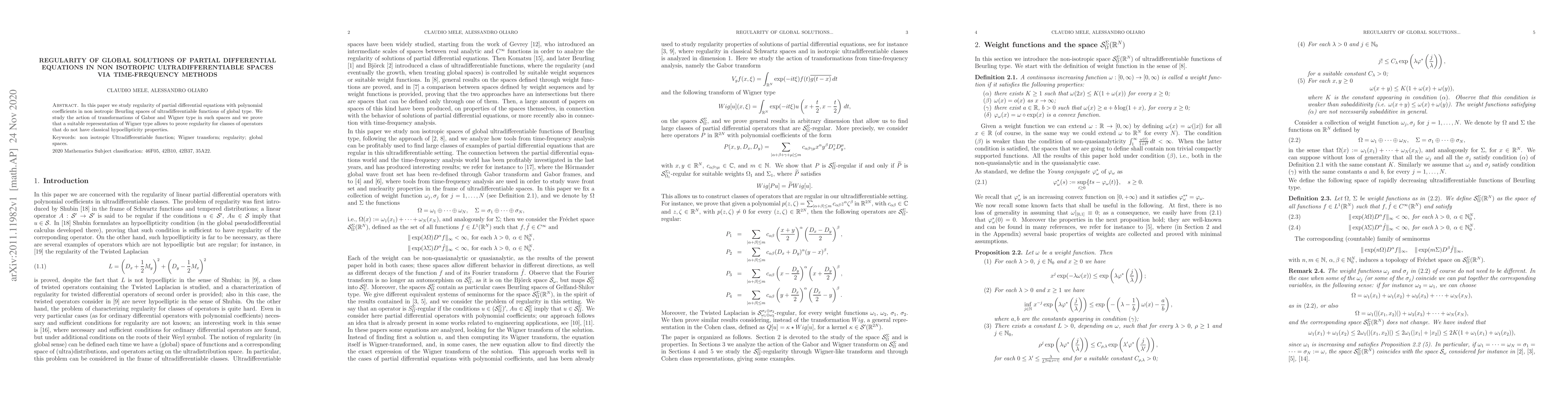 In this paper we study regularity of partial differential equations with polynomial coefficients in non isotropic Beurling spaces of ultradifferentiable functions of global type. We study the action of transformations of Gabor and Wigner type in such spaces and we prove that a suitable representation of Wigner type allows to prove regularity for classes of operators that do not have classical hypoellipticity properties.