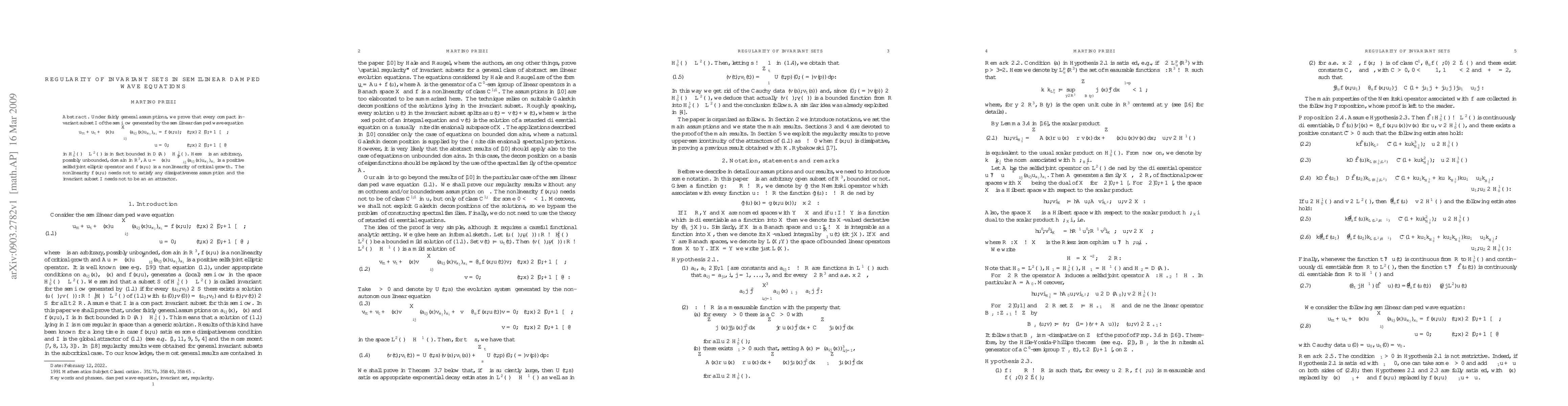 Under fairly general assumptions, we prove that every compact invariant subset $\mathcal I$ of the semiflow generated by the semilinear damped wave equation \epsilon u_{tt}+u_t+\beta(x)u-\sum_{ij}(a_{ij} (x)u_{x_j})_{x_i}&=f(x,u),&& (t,x)\in[0,+\infty[\times\Omega, u&=0,&&(t,x)\in[0,+\infty[\times\partial\Omega in $H^1_0(\Omega)\times L^2(\Omega)$ is in fact bounded in $D(\mathbf A)\times H^1_0(\Omega)$. Here $\Omega$ is an arbitrary, possibly unbounded, domain in $\R^3$, $\mathbf A u=\beta(x)u-\sum_{ij}(a_{ij}(x)u_{x_j})_{x_i}$ is a positive selfadjoint elliptic operator and $f(x,u)$ is a nonlinearity of critical growth. The nonlinearity $f(x,u)$ needs not to satisfy any dissipativeness assumption and the invariant subset $\mathcal I$ needs not to be an an attractor.