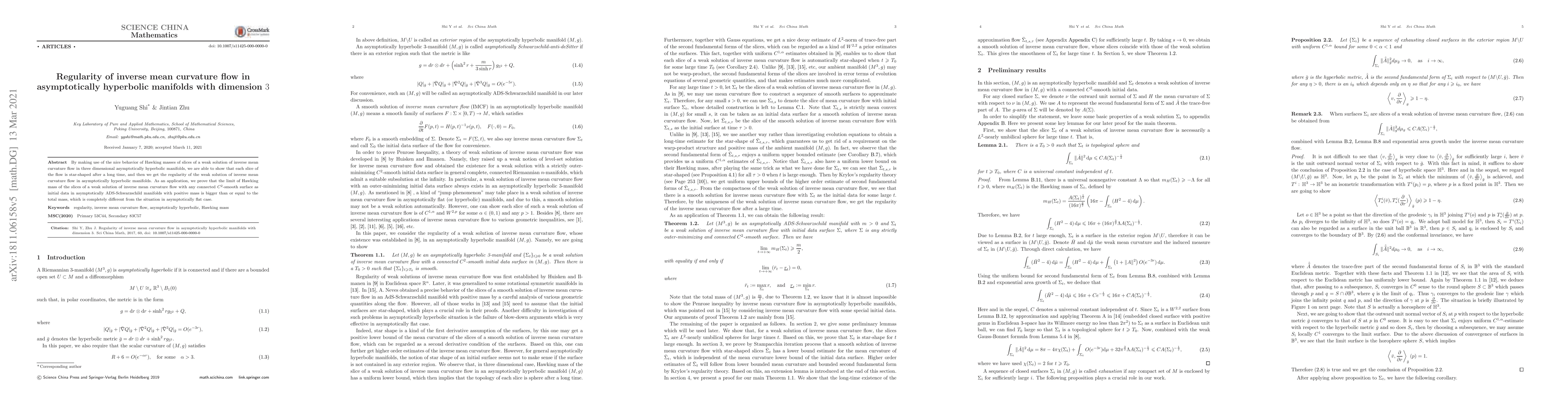 By making use of the nice behavior of Hawking masses of slices of a weak solution of inverse mean curvature flow in three dimensional asymptotically hyperbolic manifolds, we are able to show that each slice of the flow is star-shaped after a long time, and then we get the regularity of the weak solution of inverse mean curvature flow in asymptotically hyperbolic manifolds. As an application, we prove that the limit of Hawking mass of the slices of a weak solution of inverse mean curvature flow with any connected $C^2$-smooth surface as initial data in asymptotically ADS-Schwarzschild manifolds with positive mass is bigger than or equal to the total mass, which is completely different from the situation in asymptotically flat case.